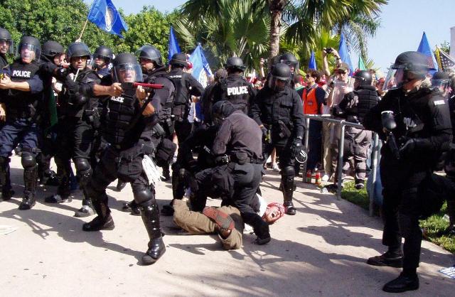There is a great hue and cry over the May Day demonstrations in Los Angeles (legitimate) that saw the LAPD in their military gear – assaulting mostly Mexican immigrants. Nobody should suffer brutalization by the police.This has been given a great deal of coverage in the media.  The thing that impressed me over the media coverage that this has been given;  is that  this assaulting and beating of people was being treated as if it was an anomaly! Those clubbed, gassed, shot with rubber bullets, at the conventions (Democrat and Republican) and at the various protests against treaty summits, received NONE of this outrage or an apology from the police? When you militarize local police departments and equip them with better weaponry and armor than those at war – you can expect them to treat all citizens as the ENEMY. I’m confused – is this the FREEDOM that we’re trying to export to Iraq etc?