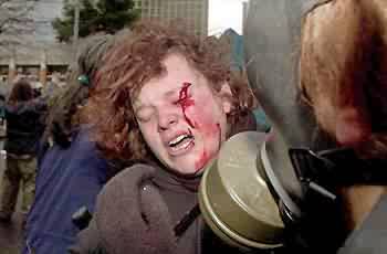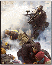 Over-funded Police State and Police Brutality: Police in Miami, Florida were outfitted in armored Ninja attire (weaponry), to attack the young and senior citizens demonstrating against FTAA, another trade policy (not debated or read by Congress)  that would result in more closed factories across the nation.  The eight million that Miami received, was diverted from funds allocated for our military in Iraq who are up against Armed Insurgents! It doesn’t take any courage to club unarmed citizens, who mistakenly thought freedom of assembly and freedom of speech still existed in the “land of the free”?