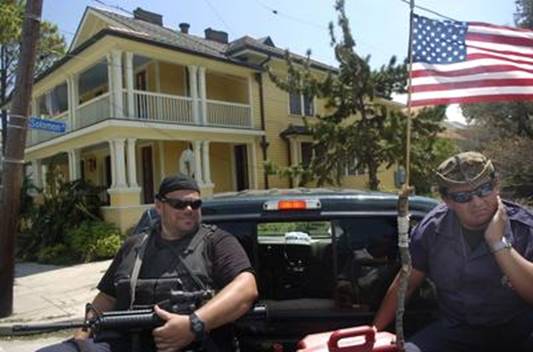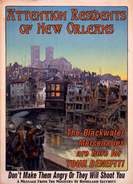 Blackwater, a private mercenary force, protects homes of the wealthy in New Orleans (not flooded) while the poor drowned or died of heat prostration.