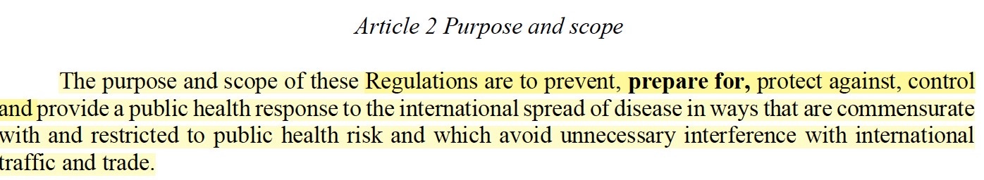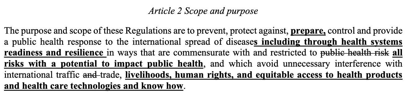 Article 2 attempted to a) expand the response to disease to a response to all risks with a potential to impact public health and b) allowed interference with human rights , livelihoods, and equitable access to health care when necessary. Both are GONE from the adopted draft.