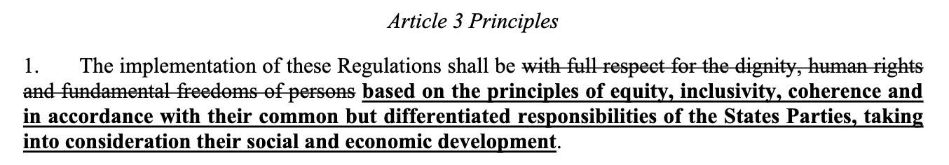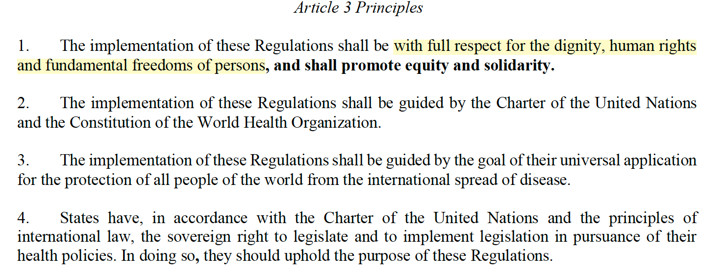 Article 3 attempted to remove dignity, human rights and freedom of persons from the IHR. This is gone from the adopted draft.
