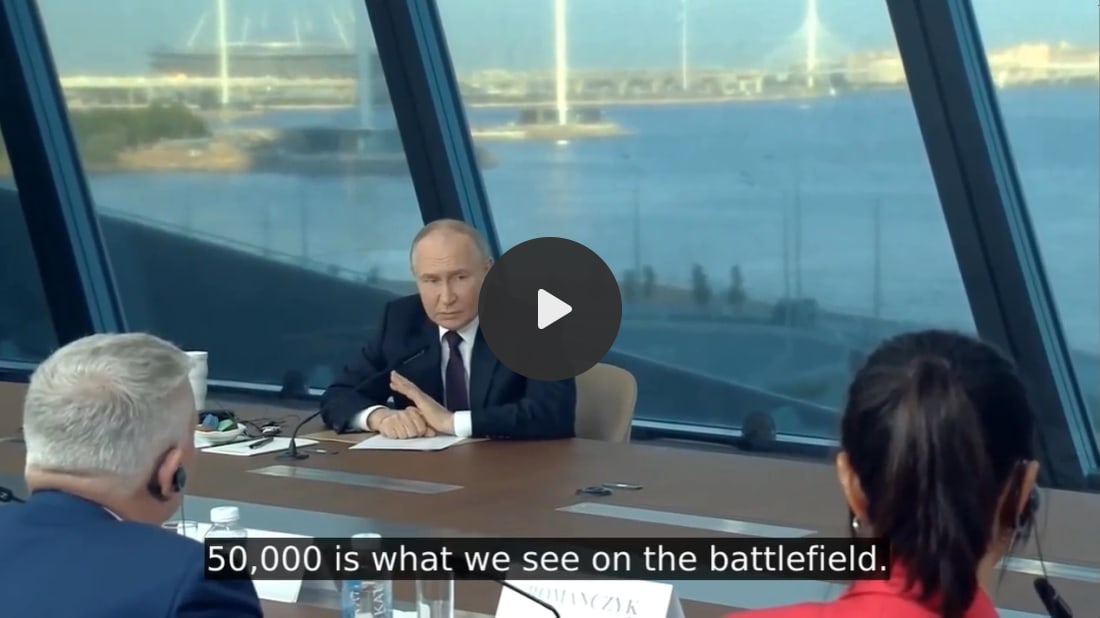 Yesterday at the official SPIEF (St. Petersburg International Economic Forum) Putin gave an extremely revealing 3-hour long open round table with foreign journalists. I will do a break down of some of the most interesting clips and soundbites, though you can see the entire important meeting here. But first let’s cover the most interesting of the revelations: The Russian MOD stopped listing official losses sometime around May of 2022, likely after it became obvious that the conflict would drag on and the losses would grow to an unsuitably painful degree. Now at the SPIEF, Putin gave the first indication since that time of Russian losses when he stated that Russia loses 1 soldier for every 5 Ukrainian ones, as well as giving an exact figure for POWs, which he states as follows: