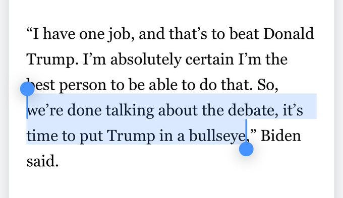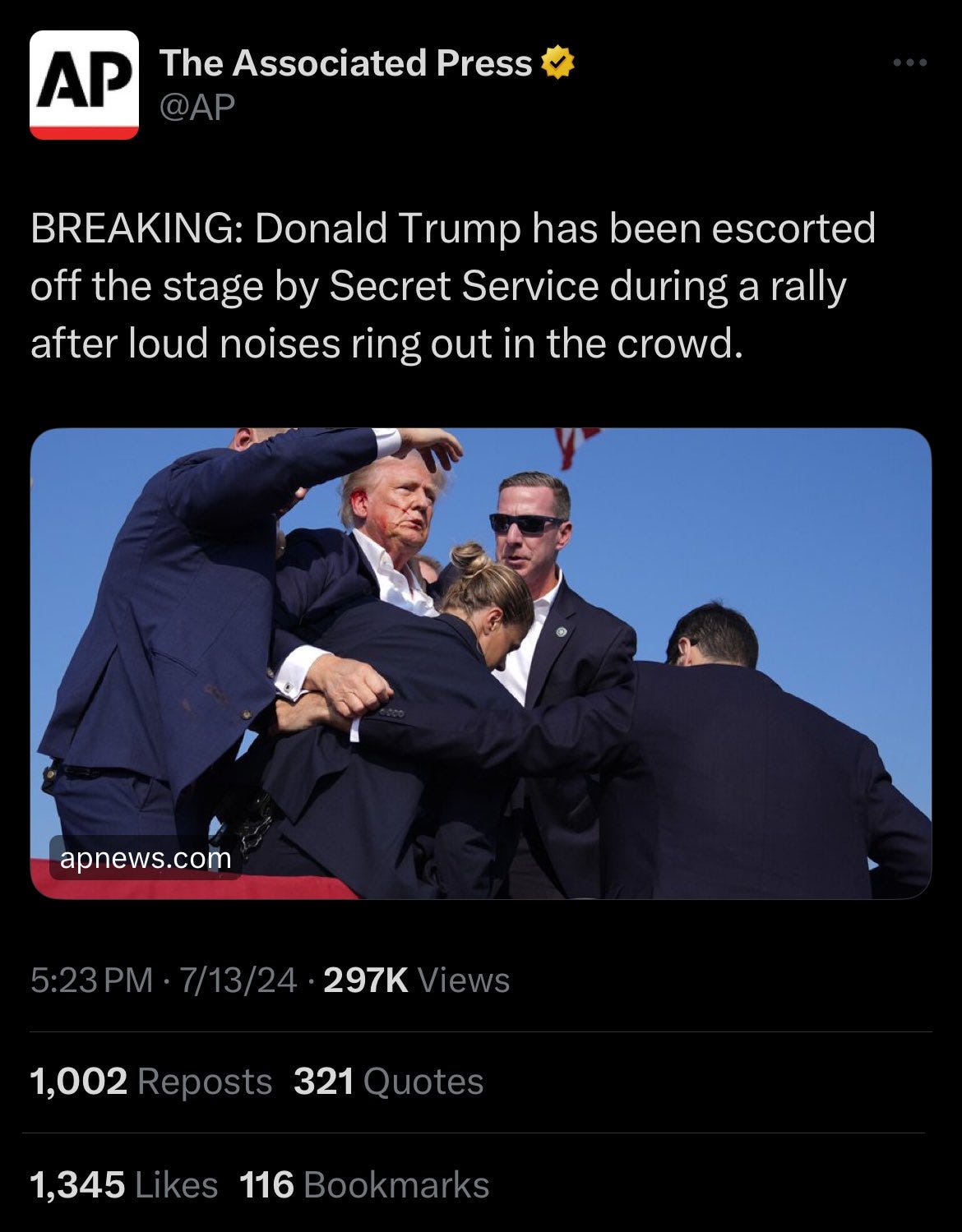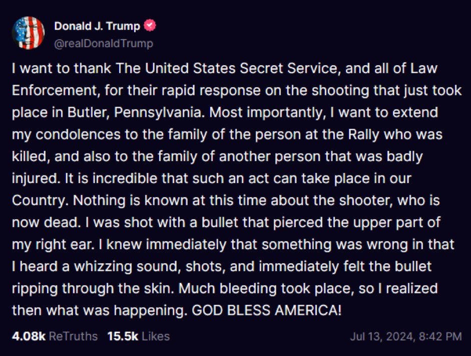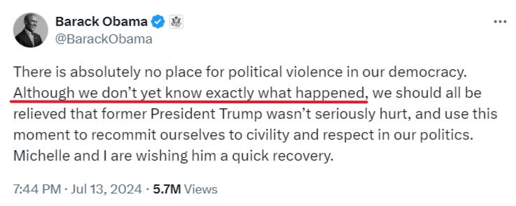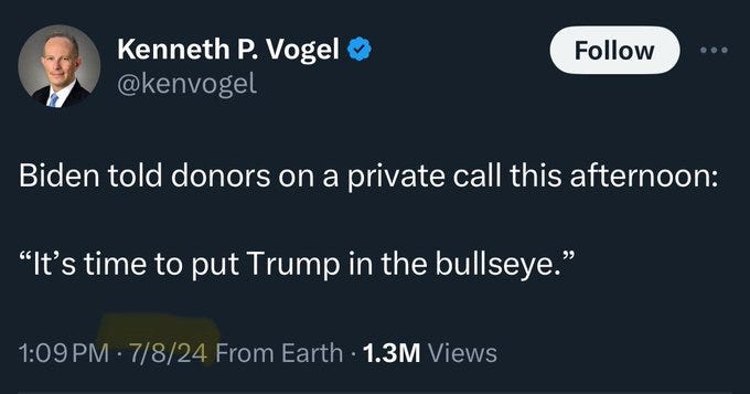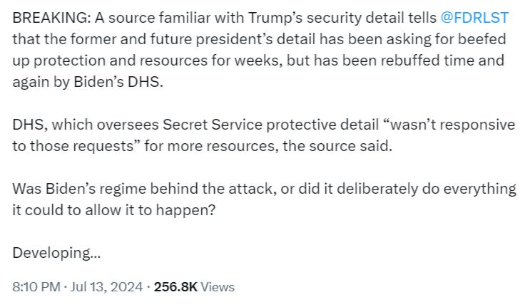First, get a look at the shameful MSM whitewashing and intentional downplaying of the event, doing everything in their power to cast it as not an assassination attempt: This should leave you speechless—I have never witnessed such an openly diabolical psyop and mass gaslighting campaign. We literally just watched the attempted assassination of a president, and the media is treating it like a superfluous nonevent. Later, Barrack Obama joined the coordinated coverup, playing dumb as per his handlers’ orders: And the final proof of the operation came as Biden gave an unplanned national address, half an hour past his newly-announced 8pm bedtime and looking all the worse for it: Watch the coordinated operation above, as Biden openly refuses to call it an assassination even when directly asked. The thing is: we know precisely why they’re doing it. It’s because if today’s event were to be given the official cachet of ‘assassination attempt’, it would completely and irrevocably de-legitimize the phony “J6” turning point which is one of the last holdfasts the Democrats have left in their quiver against Trump. You see, they’ve spent four years trying to delude us into believing that J6 was in fact a direct assassination attempt—Pelosi just said this days ago—TWICE— as another obvious dogwhistle to her radical base. Just watch for yourself: Imagine how fast the fraudulent J6 narrative house of cards would tumble if today’s event is allowed to be characterized as an actual assassination—there would be no comparison to the anodyne J6 fairytale where a bunch of old women larped around in the Capitol foyer. Now, the big thing to watch is how the regime media goes forward—particularly the middle tastemaker and gatekeeper rungs like your Rachel Maddows and ‘The View’ harridans. They will be desperate to keep Trump as far away from martyrdom as possible—that means obfuscation, obfuscation, obfuscation. They will likely continue via the old CIA playbook of tangling things up, pointlessly hyperfocusing on the procedural minutiae of the investigation into what kind of attack it was. They’ll likely drag it out for weeks, months, or however long it takes without definitively describing it as an assassination attempt, falling back on the false high horse of their “journalistic due diligence” and nonexistent “integrity”. Yet we know full well if this had happened to a democrat candidate, all the regime media would be rising up in one voice as we speak calling for the total lockdown of the country and physical purge of all rightwing and ‘ideological opponents’. Alarmingly, the chief of communications for the Secret Service, Anthony Guglielmi, has already posted their official stance on the event which likewise eschews any strongly deterministic language: Given Trump’s rebuffed attempts to beef up security, and given the eyewitness who spotted the shooter and claims to have been ignored by Secret Service agents, the above release looks highly troubling. A president was literally shot in the face, and the bullet passing near his head was captured on camera. What more do you possibly need to happen for it to be unequivocally deemed an assassination attempt, for crying out loud? This is as unprecedented as the mass gaslighting operation that went into the stealing of the 2020 election, with its bizarre and highly irregular cessation of vote counts and “sudden spike” of Biden votes at 4am. We are in uncharted waters. And what’s more, is that this global GLADIO-esque operation is picking up steam. All opponents of the global ‘Hydra’ deepstate are being eliminated, or attempts toward that end are being made. Populist and anti-imperial Slovak PM Robert Fico was just shot not two months ago. And just today Ukraine’s Budanov announced that operations to eliminate Putin have infact been undertaken, but so far have not succeeded: It’s clear things are on the brink for the globalist deepstate as they see no further way to tread water without simply eliminating all ascendant resistance leaders; their backs really are against the wall. We are entering a time of great troubles but also great hope, because given their desperation levels it’s clear the final battle is approaching and a grand turning point or realignment of sorts is almost upon us. Your support is invaluable. If you enjoyed the read, I would greatly appreciate if you subscribed to a monthly/yearly pledge to support my work, so that I may continue providing you with detailed, incisive reports like this one. Alternatively, you can tip here: buymeacoffee.com/Simplicius |