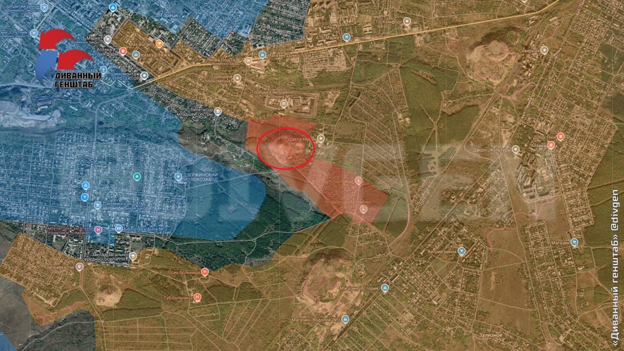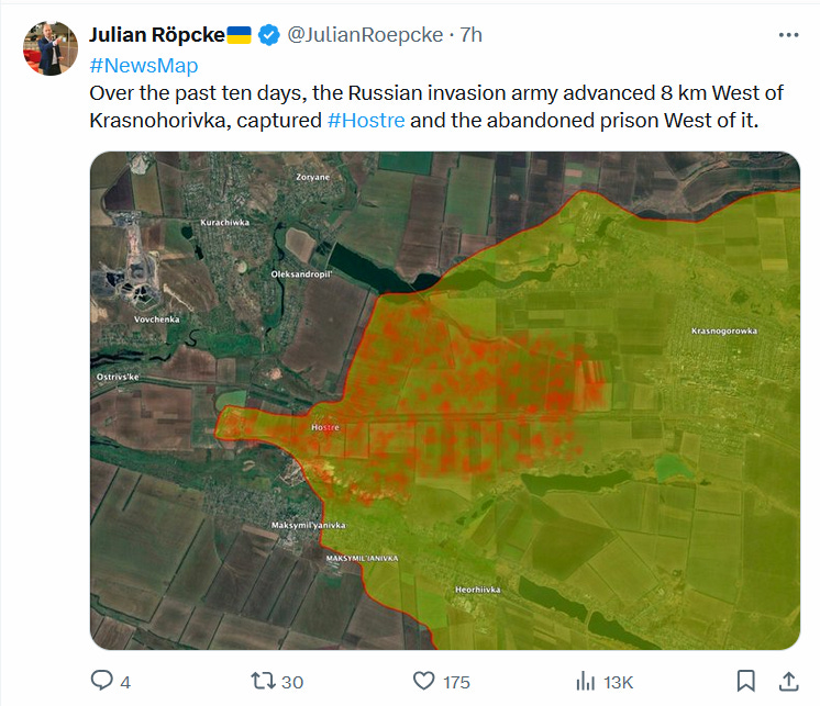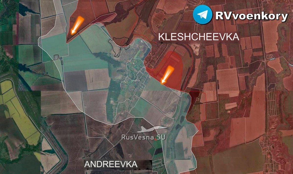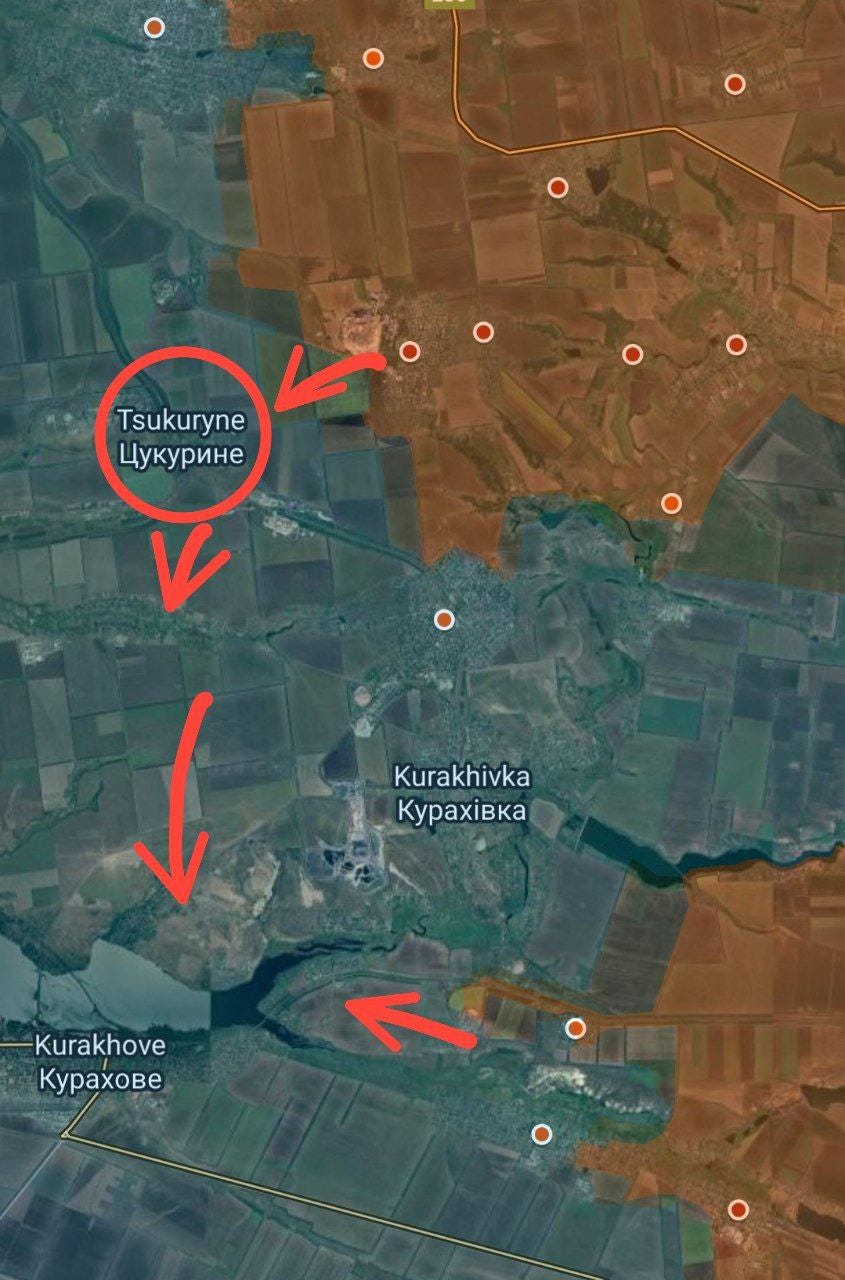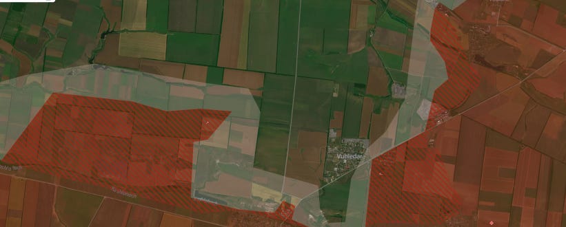 Big news came with reports of Russian glide-bomb Fabs being used on the Zaporozhye line for the first time in a large-scale, systematic way, which seems to herald the initiation of more active operations here. Moving on just east of there, one of the largest movements occurred in Ugledar, which Russian units are almost entirely enveloping now. Several maps from Deep State, Suriyak, etc.: Ukrainian report: In fact the commander of the 72nd at Ugledar was reportedly dismissed immediately after: Some reports even claimed Russian forces have begun entering the town itself: Now moving further north from there, Russian forces took several positions on the Kurakhove axis, near Gostre and Tsukuryne: Julian Roepcke bellowed about this direction in particular: In fact, here’s a video from Ukraine’s 46th Airmobile brigade defending Gostre which shows the vast scale of Russia’s attacks. This one alone claimed to involve “52 Russian vehicles”. As per usual, they did their best editing tricks in an attempt to show some kind of hits, but in reality very few losses of Russian materiel is observed and Russian forces verifiably captured their objectives: One of the problems is, most of these videos now consist of quick-cuts of FPVs hitting moving ‘sheds’—tanks with huge anti-drone weldings. These constructions are known to often take many FPV hits. One recent video of a Russian crew said their ‘Tsar Mangal’ turtle tank withstood over 100+ FPV strikes. Thus, seeing a clip of an FPV descending on a shedded tank means nothing, and in almost every case the attack likely failed. The above video consists of upwards of an entire tank battalion with potentially hundreds of ground troops involved, yet the Ukrainian brigade could only show a single “burning” vehicle, which could very well be their own—and not a single Russian casualty. That’s bad news for them and indicates a massively successful assault operation. Further north of there Russian forces made advances deep into Toretsk city itself: As well as here on the flank: “Beer” above is supposed to read Pivnichne. They made a long parallel advance on the outskirts here as well, just north of already-captured Niu-York: And north of this region we get to Klescheyevka, where Russian forces made surprise new advances: Then all the way north toward the Kupyansk zone, Russia made several creeping advances. Here from “Sandy”—which is supposed to be Pishchane—they advanced toward the Oskil River: South of there but on the same axis they captured new territory further west of Makeevka and Nevskoe nearby: These are west of Kremennaya on the Kharkov-Donetsk border. According to the Ukrainian report below it was a surprisingly large assault for such a ‘sleepy’ sector: