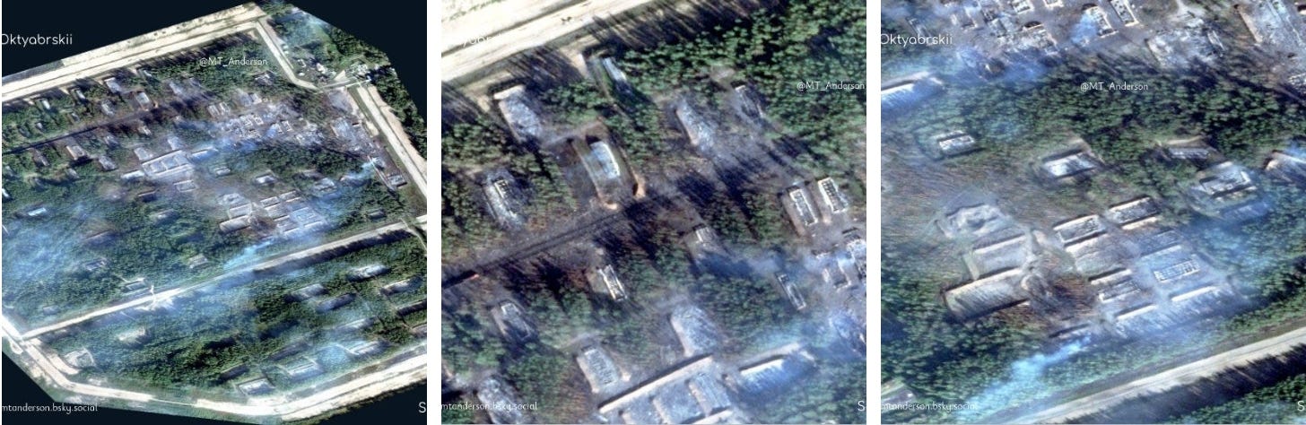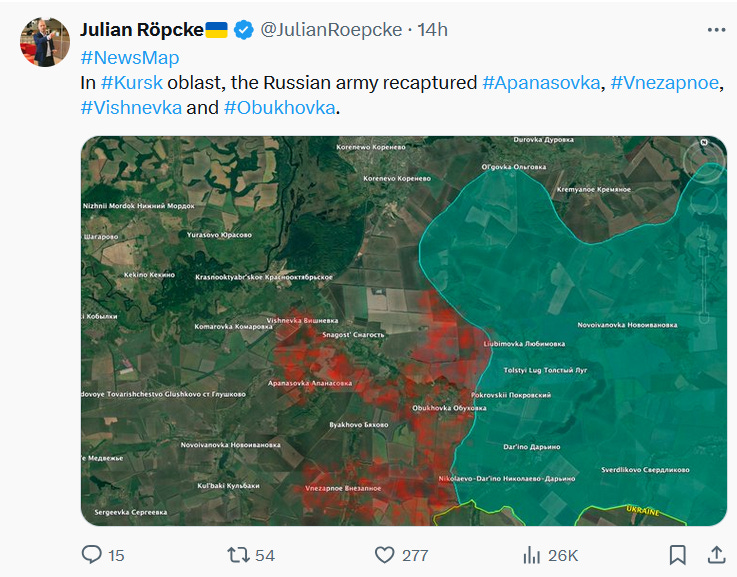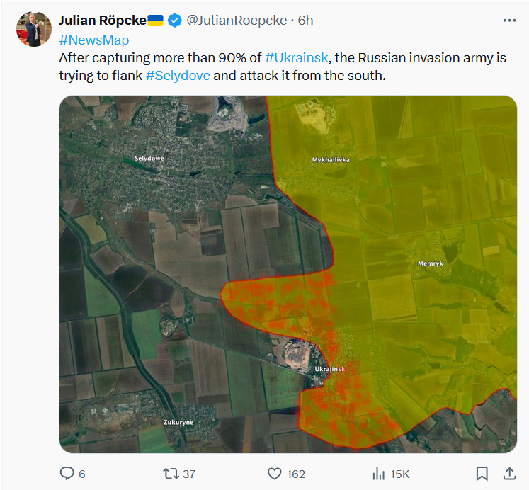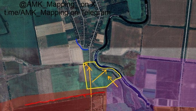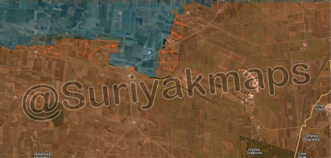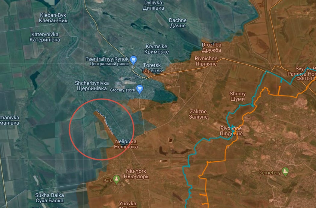 Big news came with reports of Russian glide-bomb Fabs being used on the Zaporozhye line for the first time in a large-scale, systematic way, which seems to herald the initiation of more active operations here. Moving on just east of there, one of the largest movements occurred in Ugledar, which Russian units are almost entirely enveloping now. Several maps from Deep State, Suriyak, etc.: Ukrainian report: In fact the commander of the 72nd at Ugledar was reportedly dismissed immediately after: Some reports even claimed Russian forces have begun entering the town itself: Now moving further north from there, Russian forces took several positions on the Kurakhove axis, near Gostre and Tsukuryne: Julian Roepcke bellowed about this direction in particular: In fact, here’s a video from Ukraine’s 46th Airmobile brigade defending Gostre which shows the vast scale of Russia’s attacks. This one alone claimed to involve “52 Russian vehicles”. As per usual, they did their best editing tricks in an attempt to show some kind of hits, but in reality very few losses of Russian materiel is observed and Russian forces verifiably captured their objectives: One of the problems is, most of these videos now consist of quick-cuts of FPVs hitting moving ‘sheds’—tanks with huge anti-drone weldings. These constructions are known to often take many FPV hits. One recent video of a Russian crew said their ‘Tsar Mangal’ turtle tank withstood over 100+ FPV strikes. Thus, seeing a clip of an FPV descending on a shedded tank means nothing, and in almost every case the attack likely failed. The above video consists of upwards of an entire tank battalion with potentially hundreds of ground troops involved, yet the Ukrainian brigade could only show a single “burning” vehicle, which could very well be their own—and not a single Russian casualty. That’s bad news for them and indicates a massively successful assault operation. Further north of there Russian forces made advances deep into Toretsk city itself: As well as here on the flank: “Beer” above is supposed to read Pivnichne. They made a long parallel advance on the outskirts here as well, just north of already-captured Niu-York: And north of this region we get to Klescheyevka, where Russian forces made surprise new advances: Then all the way north toward the Kupyansk zone, Russia made several creeping advances. Here from “Sandy”—which is supposed to be Pishchane—they advanced toward the Oskil River: South of there but on the same axis they captured new territory further west of Makeevka and Nevskoe nearby: These are west of Kremennaya on the Kharkov-Donetsk border. According to the Ukrainian report below it was a surprisingly large assault for such a ‘sleepy’ sector: