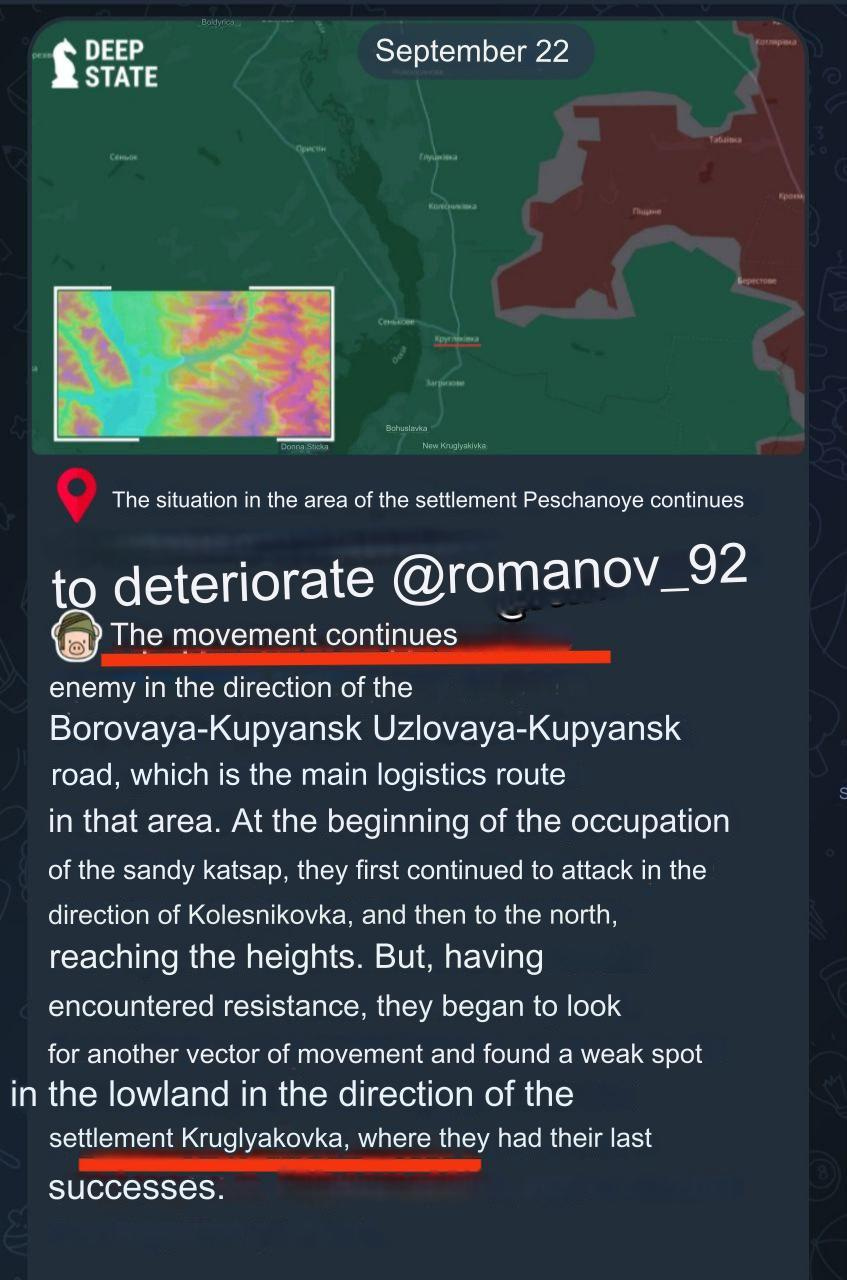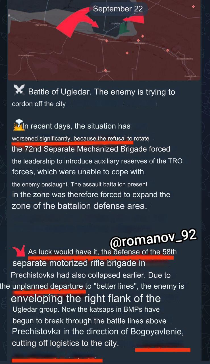 A “permanent secretariat” to maintain a “consistent” policy in perpetuity. I’ll translate the Newspeak: create a permanent central authority which no “sovereign” nation can question to make sure populist leaders can never revolt against the globalist totalitarian dictatorship and its quest to enslave the planet under one hegemonic rule. — In light of the above article making mention of the ‘overpowering global reach’ of Russian ‘propaganda’, and the concomitant push for global dictatorship to fight against this, it’s now clearer than ever what the controllers intend to do when it comes to “disinformation” policy. Just today the UN signed the ‘Pact for the Future’, which includes the ‘Digital Compact’ of new vast censorship powers against all dissenting voices. Secretary-General António Guterres plainly announces the assault on freedom: Is it any surprise, then, that this call is being mirrored all over the Western world: On the surface, it hasn’t been the prettiest week for Russia in the war. Two new depots were struck after the large Toropets one, which included the smaller brother of the Toropets, GRAU 23, just a few kilometers to the south at geolocation 56.36033513129649, 31.64913480746371: ![]() On top of this, the RS-28 Sarmat test I had warned about in the last report turned into a disaster, as the missile apparently failed in its Plesetsk cosmodrome berth, catastrophically destructing without taking off: ![]() So yes, there have been quite some setbacks for Russia this week. Not every week is going to look sterling. However, it was a week of contrasts of extremes. While Ukraine scored some big moral victories, no doubt planned for a long time with a lot of saved up fancy drones to coincide with Zelensky’s big US victory tour to conclude the war, Russia has now activated a number of advances, marking today in particular as the single most successful day of arguably the whole year, in terms of pure number of captures. Literally on every single front Russia captured major territory today in what’s looking more and more like the beginning of that collapse Arestovich gloomily predicted last time. There were captures in Rabotino, Ugledar, Krasnoyarsk, Pokrovsk-Ukrainsk region, Toretsk, Klescheyevka-Chasov Yar, all the way up to Makeevka toward the Kupyansk zone. Let’s run down each sector briefly: I reported days ago that Syrsky had begun pulling units from Zaporozhye in order to reinforce the crumbling Kursk and Pokrovsk lines. Russian forces have taken advantage and begun advancing on multiple sectors. Advances were recorded in Rabotino as well as further east along the Urozhayne-Staromayorsk axis.