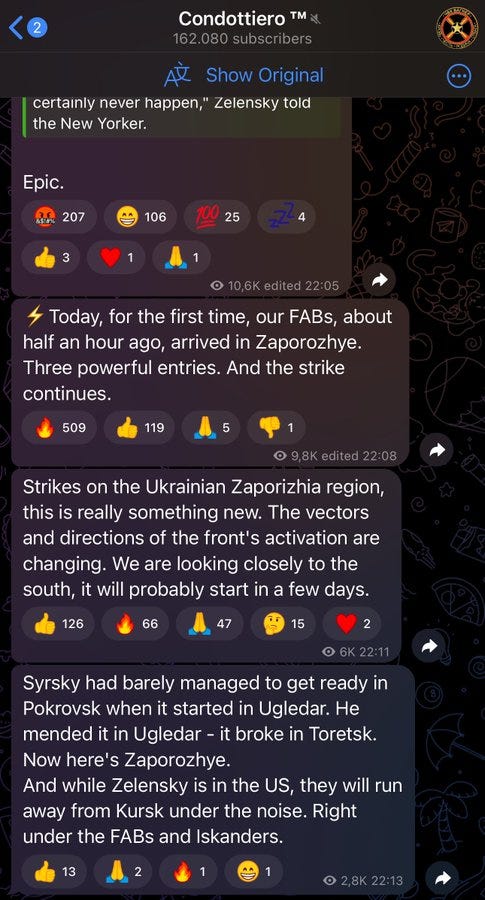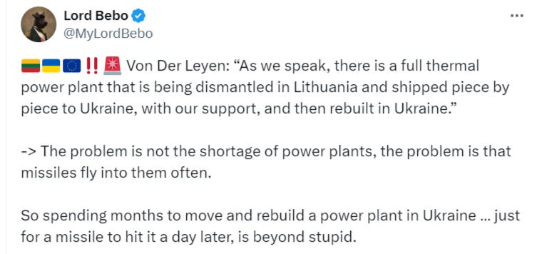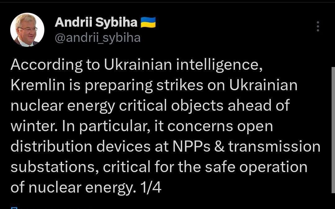 Getting back, this is all to say that Israel may see its historic chance to do as much damage and go as ‘off-script’ as possible in light of the historic leadership crisis being suffered by the US. Israel may like its chances in getting away with murder, no pun intended, without much consequences. Even more diabolically, Israel may sense the opportunity in the confusion of US’ disastrously floundering executive branch to pull the US into a wider war with Iran. In short: it is a strategy of taking advantage of America at its weakest point for maximum gain. 3. The final reasons are fairly academic: Netanyahu’s attempt to save his regime by expanding the conflict indefinitely—not dissimilar from the trap Zelensky is in. As I said in the opening, however, I remain skeptical about the war breaking out uncontrollably given that the Iranian-Hezbollah side does not seem to have a taste for major conflict at the moment, nor even consensus between the two. After all, Hezbollah has reportedlyexpressed disappointment and even irritation at Iran earlier for not carrying through with larger action against Israel. It seems clear Iran is not interested in a large-scale conflict and Hezbollah is not keen to go it alone against Israel—that’s not to say they won’t if absolutely pushed to the brink. But the point is merely that the signaling seems to suggest the Resistance side is leaning on playing the Long Game, bleeding Israel from many different vectors a little at a time. This is of course mostly due to Iran being cognizant of Israel’s plan to goad it into full-scale war against the US, particularly given Iran’s new leadership, said to be less openly belligerent. For instance, just as of this writing, Hezbollah was said to have shut down Haifa airport in the north by strikings its fuel tanks: Many people only analyze the one-dimensional, purely-kinetic military ramifications on the ground, but overlook the even more significant outlays of political capital Israel is hemorrhaging on the world stage. Iran is likely fine with watching Israel slowly lose its global standing, becoming the black sheep of the civilized world, all while its socio-economic and political fabric comes undone. So what I mean to say is that, even should Israel continue escalating its mass attacks in Lebanon, I see the Resistance playing it much more asymmetrically, with the continuation of the status quo guerilla responses and strikes on north Israel’s infrastructure, rather than posturing into some type of full-scale conventional war. This is what Israel would like, in order to get its casus belli and pull allies into an all-out conflict. Many people view this as Iran and co. being “weak”, humiliated, etc. So be it. This is how major civilizational states survive for thousands of years, by not reacting to every little provocation. Contra the fake #9 placement above, Israel has existed for barely 70 years. Iran will exist long after the bones of all the simpering chuds on social media have mouldered and turned to phosphate for the worms, and the social medias themselves have become a forgotten blink in the sprawl of time. In Ukraine, there are a couple significant updates worth looking at. To me, the most significant are reports that Russia plans to begin targeting Ukrainian nuclear plants: The reason this is significant is because for a few months now there have been reports that Russia has knocked out over 70% of Ukraine’s conventional power-generating capability, and pretty much all that remained was Ukraine’s nuclear power stations, with many pro-RU commentators wondering whether Putin would be “man enough” to finish Ukraine’s power grid off for good. This appears to be the first indication that Putin may very well have decided to completely de-energize Ukraine. Mind you, this doesn’t mean striking the nuclear power plants themselves to create Chernobyl-like catastrophes, but rather their substations and other surrounding infrastructure to effectively ‘neutralize’ the nuke plants’ ability to provide, or at least deliver, power. Europe is preparing for this consequence but in a way that leaves much to be desired, given that Russia can easily disable their so-called dismantled and re-assembled plants: Russia has also struck a ship in the Black Sea it detected was transporting weaponry to Ukraine, proving that Russia has the capability to take out Ukraine’s so-called “grain corridor” if it wanted to, but allows it leniency at its discretion. This again highlights how Russia continually attrits Ukrainian munitions stocks which compensates for Ukraine’s occasional destruction of Russia’s warehouses like seen recently. In fact, just in the past three days, Russia has struck over half a dozen weapons depots including in Odessa port, the ship that was en route to offload, and several other places. — Zelensky has now finally traveled to the US for his grand—perhaps final—tour: He himself appreciates the momentously foreboding nature of the curtain call. From his account: