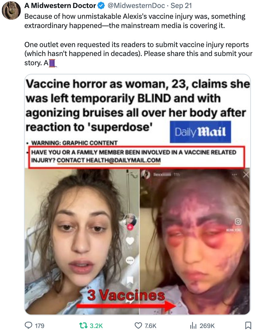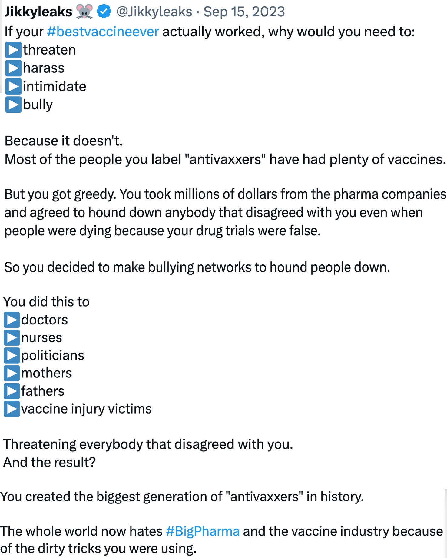 Note: Nicole posted significantly more information here (and can be followed here). Lastly, there was one screenshot from the group that was shared with me I wanted to discuss: I put a lot of time into this publication (which reciprocally has put strain on other aspects of my life and forced me to abandon things I previously prioritized), which I do this because: Because of this, a lot of what I write her is crafted in the manner I believe will most help people but I simultaneously continually regret falling short of what I want to do for everyone. One of the most common areas this happens in is when readers reach out to me asking for a directory they can look in to find an awake doctor. In turn, I have to decline that request because my colleagues (who all have full practices) have explicitly requested for me not to put them on a list that will guarantee their harassment (and likewise refuse to ever be entered into an online directory or have an internet presence). While this seems a bit over-the-top I am specifically sharing this screenshot to show there is a subset of the medical industry which is eager to do just that. ConclusionBecause of how many times I’ve seen the pharmaceutical industry pull the same scam on the public (e.g., much of what happened with the COVID-19 vaccines was a repeat of what happened with HIV, HPV, and anthrax), I saw through the pandemic propaganda from the very start. In turn, what was so depressing for me was how frequently I saw these scams work, and in each case, they increased a little bit from the previous one (the public had become acclimated to and hence did not question), so in turn, as the years went by, things became worse and worse. However, during COVID, something very strange happened. Every single stop was pulled out, and give or take every PR tactir that could be done (e.g., lots of sleazy promotions) was, and this continued even once it was clear a lot of people were being severely injured by them. In my opinion, the biggest mistake made was the choice to mandate healthcare workers to get the vaccines (as they were the most likely to comply with vaccinating and were then used to create “trust” to sell the vaccines to everyone else). This is because many of them were injured by the vaccines, and hence became willing to start publicly questioning everything they had been told—which is a huge problem since the “public’s trust” of the medical system is built upon them listening to what doctors and nurses tell them. Groups like Shots Heard are trying to correct this mistake after the fact, but I think what they are doing is an exercise in futility, as while they were able to ruin a few people’s lives, the truth was not on their side and the “nightmare scenario” they had predicted (the public turning against vaccination) is now happening. It’s possible if more money goes into the group, and they get more competent employees, they could make more of an impact, but at this point, public opinion has turned so much against them that I doubt this will work (and instead most of the remaining pro-vax advocates online are “not the best”). In turn, I and many others believe that if the medical establishment wants to regain the public’s trust, it needs to start being honest, stop misrepresenting its products, and trust the public to do what makes sense (e.g., Alexis’s injury would not have been a historical PR disaster if they had immediately acknowledged it, apologized, tried to take care of her and then argued it was a “one in a million” side effect). Medicine does many critical and important things right, but if that gets blurred with unsafe and ineffective products being sold for unscrupulous reasons (e.g., greed), the whole sector will suffer. In short, the medical profession needs to come to terms with the fact they no longer have an unquestionable faith from the public they’ve relied upon for decades and that if they wish to regain it, it needs to be earned rather than demanded. My hope thus has been that the public’s response to what they did during the pandemic will make that lesson clear to them (e.g., never pull anything like COVID-19 again because it will cost the industry a lot of money in the long term), but since human beings never want to let go of wealth or power, many in the medical and public health establishment have still not come to terms with the fact their way of doing things will no longer fly. For example, a lot of money has been invested in the “next pandemic” and the WHO has been aggressively pushing to legalize what they did during COVID for all future “emergencies.” Fortunately, while the stories in this article are heartbreaking, I actually view them as a positive because they show that the medical industrial complex’s power is actually quite limited and they simply can no longer compete in the era which has been made possible by the free diffusion of information on the internet. This likewise is why I avoided directly attacking most of the people who coordinated these attacks—as while they are horrible people, they are simply a symptom of the current era we are in and soon will be viewed in the same way the cultists from many other disastrous (and now widely reviled) social movements were. At the same time however, I believe these people now recognize how dire their situation is, and to maintain their vanishing grip on power, much in the same way these groups targeted dissident physicians, more and more draconian attempts are being made at censorship at a societal level. For example as I showed here: •Recently, Hillary Clinton called for criminal penalties to be levied against her political critics so others would be deterred from speaking. •Kamala Harris recently stated Elon Musk should have his privilege to use Twitter revoked if he does not rein in dissident voices on the platforms. •Kamala Harris’s VP stated the constitution should not protect misinformation or “