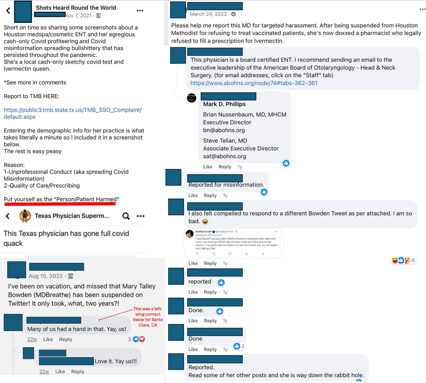 Note: I describe myself as “liberal” but the current definition of “the left” is very different from what many of us signed up for when we became Democrats. Private Social Media GroupsPrior to my free time getting eaten up by this newsletter, I would often join private online groups with anonymous accounts so I can get a sense of the sociology of different demographics and get a much larger pool of data to work with (e.g., I find what’s in support groups for people with pharmaceutical injuries to often be much better than what I can find in papers). One of the demographics I often sample are groups for healthcare workers (especially physicians) and again and again, I was struck by how their discourse always got taken over by left-wing physicians who vehemently hated anything which challenged the pharmaceutical narrative, even when the members made it very clear the pharmaceuticals they were using were clearly failing them (or their children). By the time COVID started, I joined what later became the largest online COVID-19 group and noticed within it: •Everyone was panicking over the fact they couldn’t treat COVID-19 and were themselves at risk. •Everyone was desperate for some type of guideline to be authored by an authority they could pass around so they could know what to do. •No one had any interest in considering alternative treatments for COVID-19 (e.g., hydroxychloroquine), and whenever someone suggested the group descended upon them like a pack of hyenas. •The group was very willing to go after dissident physicians. For example, after the ER doctors in Bakersfield gave a statement to the media that the harms of lockdowns were causing more harm than benefit (which is now generally accepted to be true), the group became absolutely incensed about (e.g., they claimed it was being done because the doctors had a conflict of interest since they owned an urgent care which lost business from lockdowns and they stated the doctors were killing people with their misinformation). In turn, the Covid group activists discussed filing complaints against the doctors with California’s medical board, left fake negative reviews on Yelp pages for their Urgent Care business, and joined together to write a statement they submitted to the ER doctor’s specialty college which resulted in those organizations publicly disavowing the doctors. All of that was really childish and ultimately didn’t matter (especially since the Bakersfield doctors ended up being proven completely correct), but as far as I could tell during the year I spent in the group, it was their largest “accomplishment” (which they repeatedly patted themselves on the back for). Once I started spending time on Twitter, I noticed there was a group of doctors with moderate sized followings (e.g., typically around 8-20k followers) who would consistently attack things people I knew tweeted out. What was noteworthy about it however was that: •They were very fast to respond to these posts. •They typically said the same things (which would then be copied by other people who weren’t doctors). They also tended to continually share articles from sciencebasedmedicine.org, a site that is well known for belligerently and illogically attacking anything unconventional. •They felt and thought very similar to the difficult physicians I’d seen in the previous groups (e.g., the COVID ones). •Initially I tried to engage with them in dialogs, but I found they were completely unreasonable or willing to consider anything I mentioned (e.g., their minds were so set on confirming their reality, that they would rapidly misinterpret something I wrote and attack their misinterpretation of what I said, but then refuse to discuss the subject when I pointed out that was not what I said). After a while, I got the sense they were fairly similar to many of the other trolls I’d engaged with online in the past (e.g., they always argued in bad faith and their only goal was to create a scene you were dragged into) and despite being MDs, weren’t actually very intelligent, so I heeded the advice Ed Dowdgave me “never engage a troll—all you accomplish is give them a platform and elevating them.” Because of the above points, I was relatively certain these people had to be in some type of private group which was even more rabid than the ones I’d been in before, but I just didn’t feel motivated to track it down. However, I was a bit surprised when I found out just how organized they were. Private GroupsI lost patience with the physicians in the COVID groups, so I was gone from them long before the vaccines hit the market. Nonetheless, once they came out and I began to see an immediate deluge of severe injuries and deaths (which greatly exceeded what I had expected for the vaccine), I noticed most of my (fairly conservative) colleagues would make up remarkable rationalizations in their minds to keep on pushing the vaccines so I could only imagine what was happening in these left-wing groups. Fortunately, doctors and nurses did start speaking out publicly, and I noticed each time they did, it was like they stirred up a beehive, with their posts rapidly getting removed from Twitter and many of them facing real life professional repercussions (e.g., being fired from their job, losing hospital privileges, or having a lot of medical board complaints filed against them). For example, this is what happened to Dr. Bowden: Note: medical board complaints are a major issue for a doctor because they are extremely time consuming and costly to deal with, the board is obligated to investigate any complaints they receive (especially those from doctors), and once you lose your license in one jurisdiction the other state medical boards will typically rescind it too. Furthermore, every physician does things that are not in accordance with the existing practice requirements, so if a medical board wants to find something to nail a doctor on, they typical