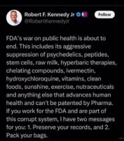 So I will be very pleasantly surprised if Bobby Crime Family Kennedy makes any significant difference whatsoever to the way that big Pharma, CDC, FDA etc etc are run