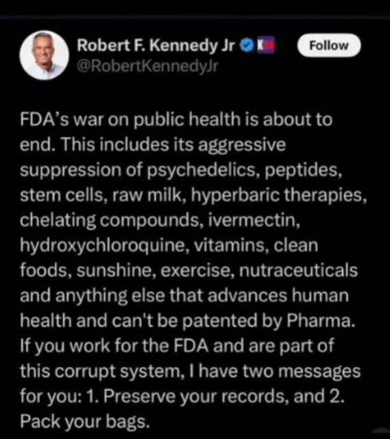 He promised to take on the FDA, CDC, HHS, NIH, NIAID, USDA, EPA, FCC — and any other federal agency that puts corporate profits ahead of public health.