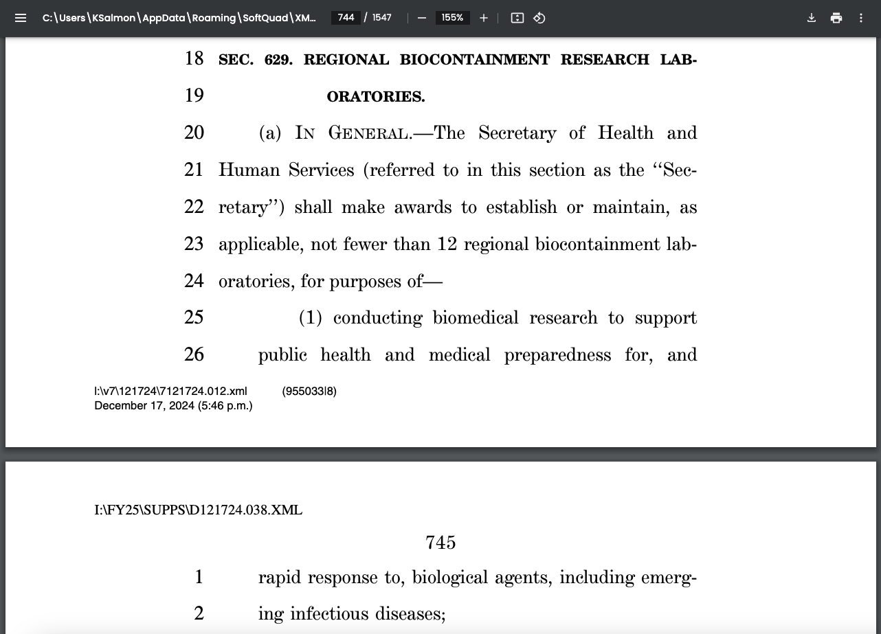 More Biolabs & Deadly Pathogen ResearchPages 744–48 of Speaker Johnson’s bill award more than $100,000,000 to “establish or maintain” no fewer than 12 regional biocontainment laboratories. These are labs with BSL-2 and BSL-3 safety designations. These labs work with some of the most dangerous pathogens in the world, including Mycobacterium tuberculosis, a deadly airborne bacteria causing tuberculosis and responsible for millions of deaths annually; and Bacillus anthracis, which causes anthrax and is notorious for its use in bioterrorism. The labs also handle viruses like SARS, like SARS-CoV-2, which causes COVID-19, MERS, as well as yellow fever and West Nile viruses. The bill earmarks “$52,000,000 for each of fiscal years 2025 and 2026” for these biolabs, to “remain available through December 31, 2026.” The stated purposes of these new labs include: