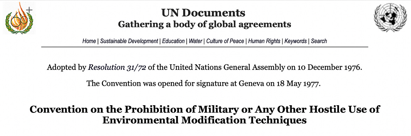 The historic 1977 Convention ratified by the UN General Assembly banning“military or other hostile use of environmental modification techniques having widespread, long-lasting or severe effects.”