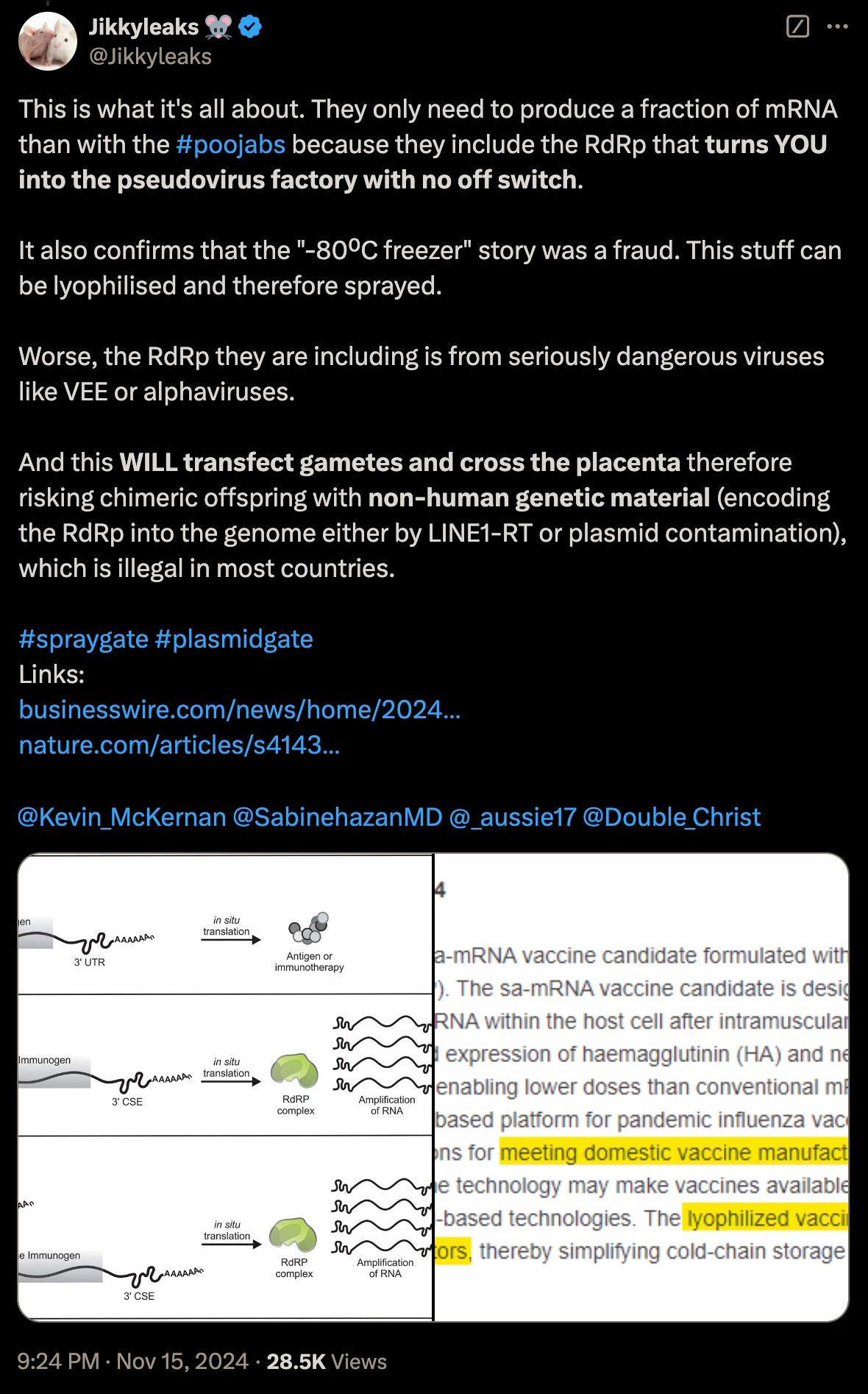 Getting back to the comments, this next trio perfectly exposes the darker agendas residing just beneath the “health” public relations cover stories: Death Cult indeed, with the technocrats foisting these peaceful cullingschemes upon us and our beloved furry family members alike; to wit: Yes, now that we have unequivocal proof that Replicons, or “self amplifying” RNA “vaccines” do in fact exist, it is no stretch of the imagination to conclude that poisoning pets and livestock with these gene altering products that genetically modify the injected into self-replicating “vaccine” shedding factories is one of many depopulation strategies being deployed against humanity; in fact, transforming any carbon based lifeforms not limited to humans and pets into shedding vehicles will ensure total genetic modification across all species. We are also seeing other nefarious “vaccine” strategies incorporating aerosolization methods akin to Bill Gates’s frankenmosquito flying “vaccine” syringes: This is not just about poisoning our pets, it is about poisoning and genetically modifying the entire planet into an unimaginable global horror show dystopia… This is the last day of this LIFESAVING CHRISTMAS SALE, so please take full advantage and become as healthy as possible by using code XMAS20 to receive 20% OFF lifesaving products like the Nobel Prize winning miracle drug Ivermectin, the no less miraculous Fenbendazole, Doxycycline, the full spectrum organic CBD oil containing 5,000 milligrams of activated cannabinoids and hemp compounds CBD, CBN & CBG, the powerful immune support nutraceutical and spike support formula VIR-X, and the healthy sugar alternative FLAV-X. Upon adding products to your cart, please go to the cart icon at the top right corner of your browser page and click it, then choose the VIEW CART option whereby you will be redirected to a page where you can enter the code XMAS20 in the Use Coupon Code field. Sale ends Sunday, December 29th (midnight eastern time), 2024. Please contact the company directly with any product questions: info@virex.health They want you dead. Do NOT comply. |