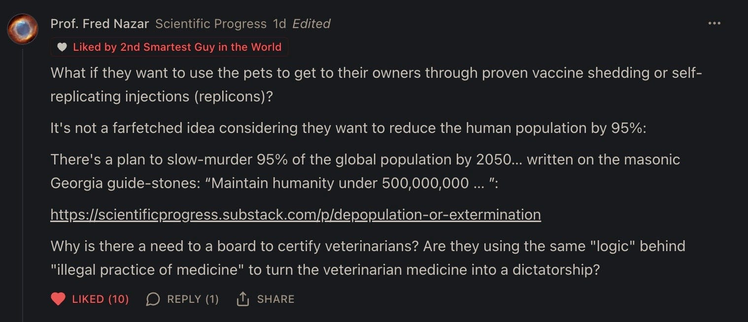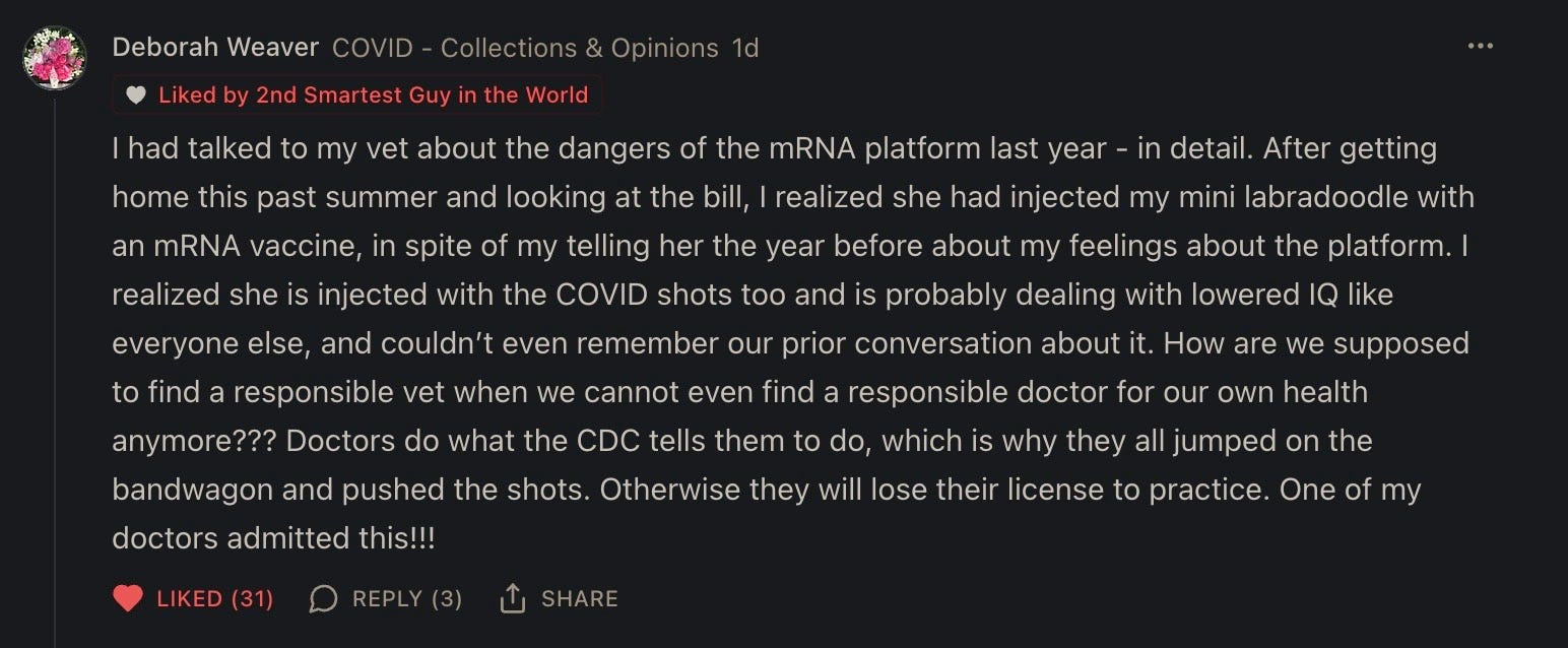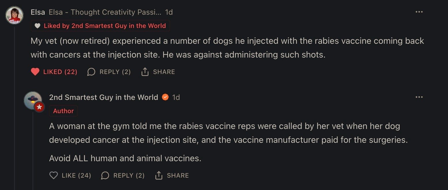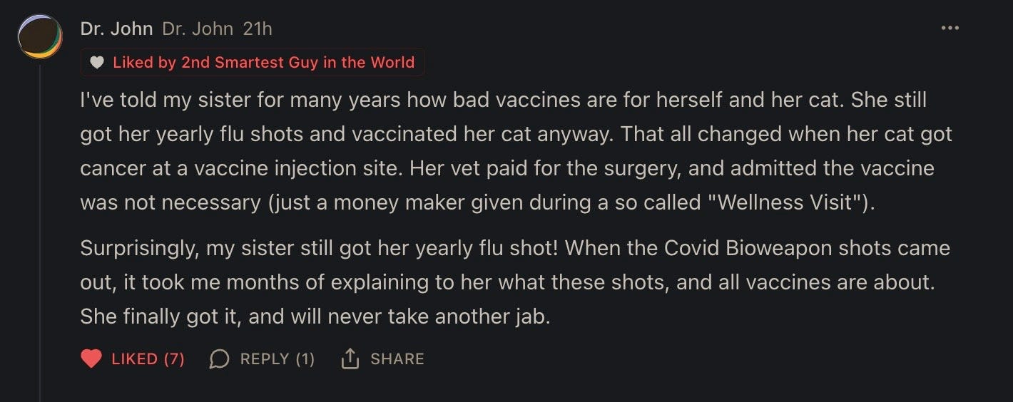 Sun 3:42 pm +00:00, 29 Dec 2024| As usual, this Substack’s subscribers once again provide essential context and insights when writing their comments, and in yesterday’s bombshell article… …we were all treated to especially fascinating and incisive experiences regarding the Veterinary Industrial Complex and their pet poisoning program. Let us review some of these subscriber comments, starting with the most popular: The fact that a vet can inject anything into a pet without the owner’s express approval means that are quite literally committing a crime. And yes, many people that were conned into taking these Modified mRNA slow kill bioweapon “vaccines” are suffering from VAIDS-induced symptoms that may express as brain damage, or impaired cognitive function. We know that these injections cause prion-based disease, and early onset Alzheimer’s Disease cases have surged since their rollout. It is next to impossible to find a responsible vet these days, and just like medical doctors, they are all far too scared to lose their licenses and effectively go out of business. And yet, there are vets that finally allow themselves to appreciate that harms of their handiwork: The rabies vaccines are all risk and no reward; in other words, these vaccines only injure and ultimately reduce lifespans with no upside whatsoever given that less than 2 people die per year from rabies. Also, there are no quality RCT with placebo control group studies showing any efficacy in the prevention of rabies with these injections; therefore, when a vet attempts to make the claim that there are so few human rabies cases per year because of the rabies vaccine, they are opining from a place of ignorance and/or mendacity. The next comment is particularly intriguing because it exposes the entire vaccine scam for both people and pets, while providing a prime example of how profoundly entrenched the societal brainwashing is when it comes to the deadly junk science discipline known as vaccinology: This perfectly jibes with my aforementioned comment about how the vaccine manufacturers all know full well that they are murdering pets with their toxic injections, and how both they and the vets administering these poisons will immediately pay up for cancer surgeries that they caused. But no matter the good will extended in these “free” veterinary treatments, the beloved furry companions are irreparably damaged with greatly reduced lifespans thanks to these iatrogenic “immunity” toxicants. We may assume that Dr. John is that rare medical doctor that truly understands just how deadly the entire vaccine agenda really is, and even he with his far above-average expertise had tremendous difficulty in breaking the Medical Industrial Complex spells and associated cognitive dissonance that his sister was suffering from, and that was after she had made the connections regarding her poisoned cat. Thankfully, he finally got through to her, but many of us know from firsthand experience just how difficult it is to wake people us from their mass ritual bio-suicide programming. Also, as this Substack had previously written ad nauseam that flu shots are a total fraud, and that it is medically impossible to inoculate for anyrespiratory disease by injecting the deltoid with any vaccine, the following article entitled, The Flu Vaccine: Science at its Worst, ended with the following irrefutable takeaways: