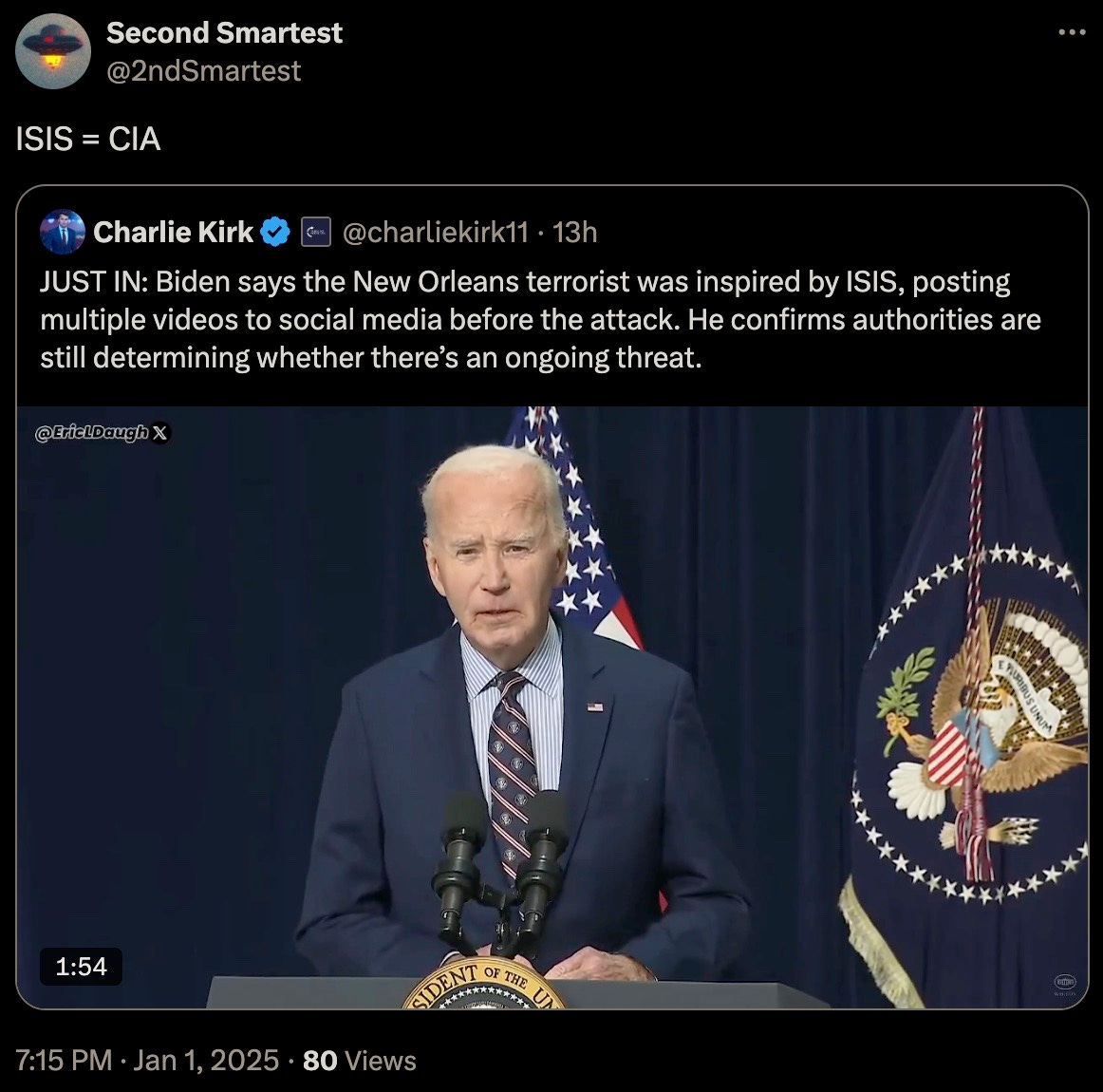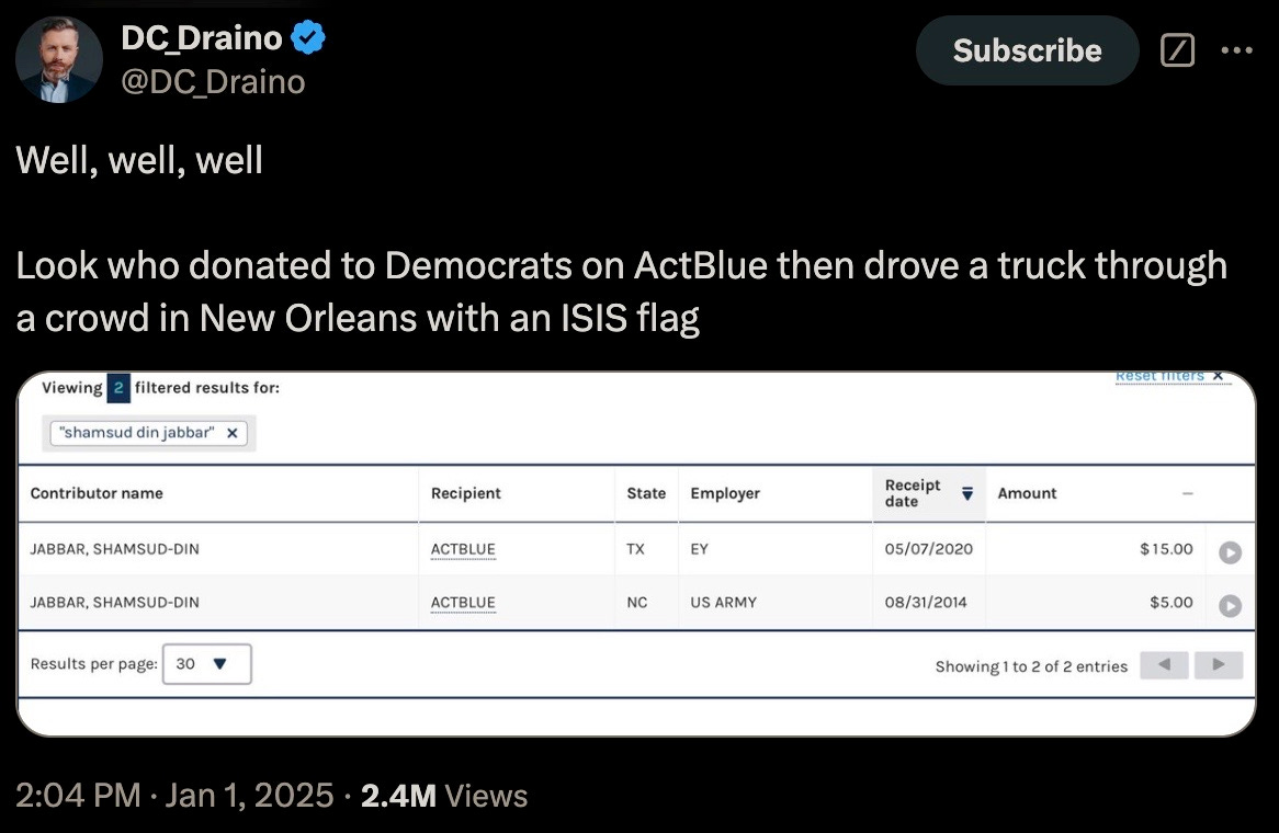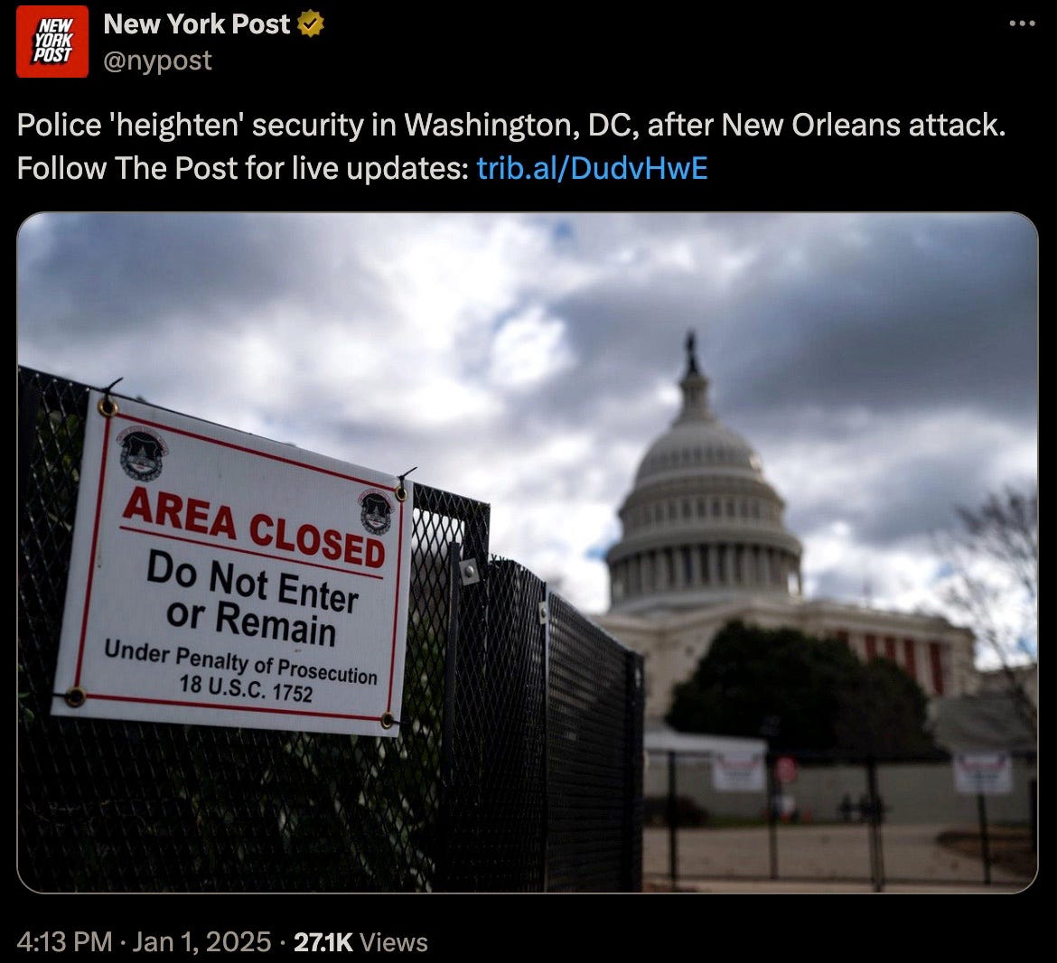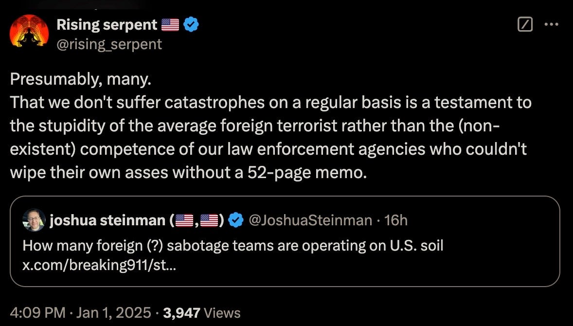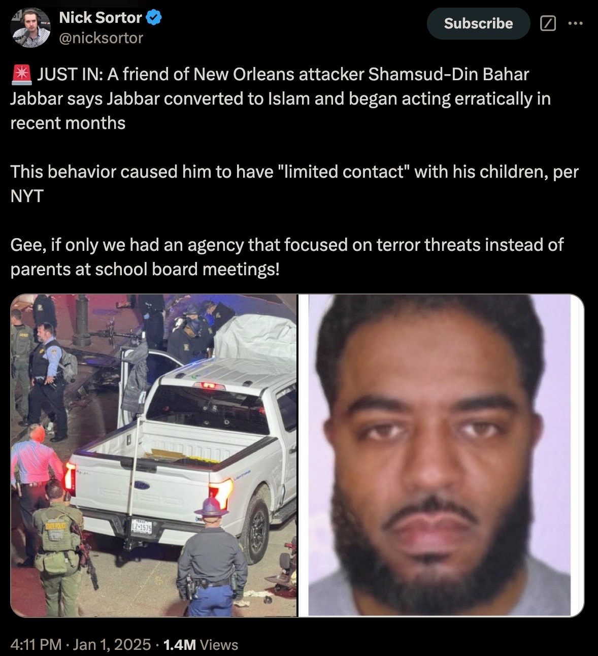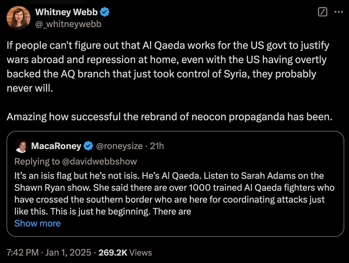 Thu 2:24 pm +00:00, 2 Jan 2025| With President Trump’s second inauguration fast approaching, the 4th branch of government often referred to as the Intelligence Industrial Complex have now commenced the deployments of their various false flag and psyop events. Concurrent to breaking out their PSYOP-BIRD-FLU followup scamdemic, which is clearly not inducing sufficient levels of mass fear in the populace, we are now being treated to the terrorism phase of their desperate bid to remain in power. More than 30 people were injured and at least 15 killed during a New Year’s Day terror attack when US-born Army vet Shamsud-Din Jabbar rammed his pick-up truck into revelers on Bourbon Street in New Orleans in wee hours of the night. Shamsud-Din Jabbar was inspired by ISIS after converting to the radical religion of peace: The pixelated Islamist after being neutralized by local law enforcement: The ISIS flag that was in his pick-up truck: Of course, the treasonous and criminal FBI were hard at work out of the gate gaslighting anyone who still believes a word of what they say: The FBI, a wholly illegitimate agency, have been the guardians of radical Marxism and enemies of We the People since inception, defending anyleftist terrorist, and the higher the body count, the greater the agency spin. It would then come as no surprise that Shamsud-Din Jabbar was in fact a proud Democrat: In case anyone somehow still believes that the FBI is anything but a radical Marxist agency itself, their own X post should dispel any doubts of that: And would the FBI ever investigate their partners-in-crime?: That other criminal Three-Letter Agency that is historically in on all kinds of domestic and foreign terrorism, not limited to the PSYOP-19 and PSYOP-BIRD-FLU scamdemics and associated slow kill bioweapon “vaccines,” is more than likely complicit in these latest false flags: The installed senile ice cream licking diaper soiling pedo puppet “president” has confirmed what his CIA and FBI handlers have ordered him to perfunctorily mumble-reiterate, but what “Biden” was not told to mention was that our latest domestic terrorist (versus those other “domestic terrorists” aka the antivax deplorable patriots) was more than likely on the FBI’s radar all along: It would be anything but a shocker to learn that Shamsud-Din Jabbar was actually an FBI asset activated ahead of Trump’s second term, and that given that for the last four years the Southern Border was deliberately opened wide up with the express purpose of importing thousands upon thousands of military-aged men that now constitute multiple sleeper terror cells embedded all across America, and ready to be activated at a moment’s notice: All of this Cloward-Piven treachery has been plotted decades ago by the CIA and FBI, who along with the DoD and Pentagon represent a not insignificant composition of the Intelligence Industrial Complex that is actively waging both soft and kinetic war on We the People: And ISIS is just another spinoff of Al Qaeda and vice-versa, with both being created by the US Deep State and their various assets like Manchurian Candidate par excellence Barack Hussein Obama: Some of the rotten fruits of Barry the Drone King’s treason: The useful idiots have also been reactivated to reinforce the incoming false flags: To further seed and normalize the forthcoming false flags more fear-mongering: Additional “investigations” announced: Concurrent to the New Orleans attack, another especially symbolic terror event was executed right in front of one of President Trump’s hotels, blowing up PSYOP-MUSK’s highly combustable Cybertruck: Does anyone still really believe in “coincidences?” What authorities should be investigating are the likely connections between these two terrorists and their handlers and masterminds over at the FBI and CIA, but then again these lawless agencies never investigate themselves, unless said investigations are in themselves coverups. But the bomb squads and hazmat teams have been deployed after the fact: Circling back to NYC and ever more “coincidences:” That’s a hell of a lot of false flag events in a single 24 hour news cycle to usher in this brand-spanking New Year… As the escalation of Deep State false flags and psyops are being readied for us, now is the time to become as healthy and as hard to kill as possible: Please take full advantage of the LIFESAVING NEW YEAR’S SALE by using code NEWYEAR20 to receive 20% OFF lifesaving products like the Nobel Prize winning miracle drug Ivermectin, the no less miraculous Fenbendazole, Doxycycline, the full spectrum organic CBD oil containing 5,000 milligrams of activated cannabinoids and hemp compounds CBD, CBN & CBG, the powerful immune support nutraceutical and spike support formula VIR-X, and the healthy sugar alternative FLAV-X. Upon adding products to your cart, please go to the cart icon at the top right corner of your browser page and click it, then choose the VIEW CART option whereby you will be redirected to a page where you can enter the code NEWYEAR20 in the Use Coupon Code field. Sale ends Sunday, January 5th (midnight eastern time), 2024. Please contact the company directly with any product questions: info@virex.health They want you dead. Do NOT comply. |