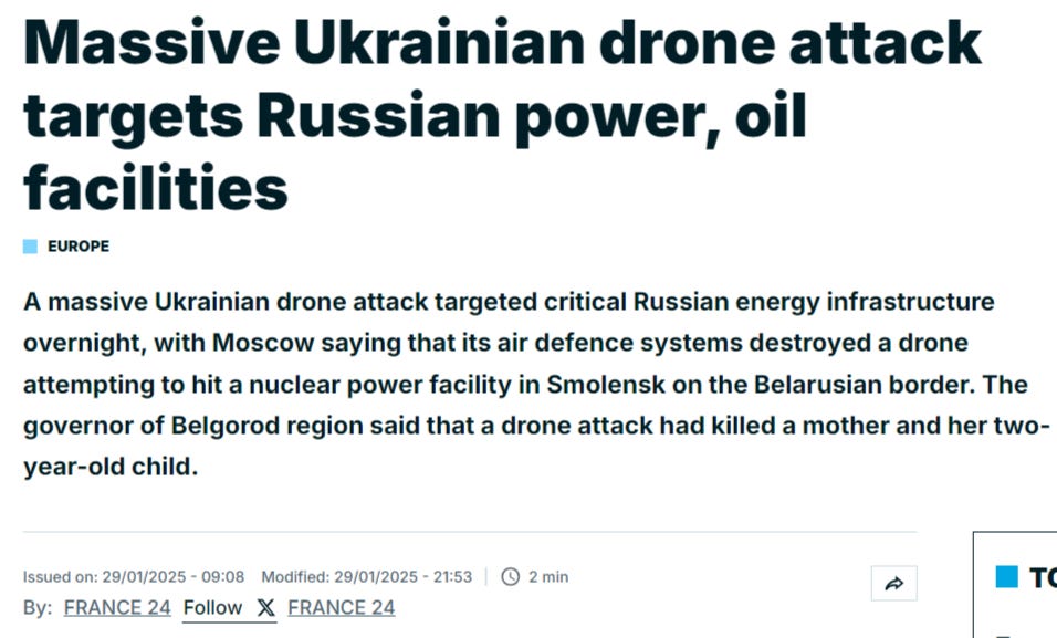 There were many other small advances, for instance near Seversk, in Chasov Yar, and south of Pokrovsk near Novoelyzavetovka, and Kursk region as well. A few last items: A Ukrainian FPV gets one of the first FPV-on-FPV kills against a Russian fiber-optic drone: — Most have likely seen by now—an F-35A spectacularly crashed in Alaska’s Eielson Air Force Base: It is something like the 31st total crash of the troubled airframe. Now as of this writing, a Blackhawk helicopter has reportedly crashedinto a smaller regional passenger jet in Washington DC, causing a mass casualty event with reportedly no survivors: — Lastly, a humorous video from Matt Orfalea exposing the media’s risibly propagandistic coverage of the Ukraine war: |