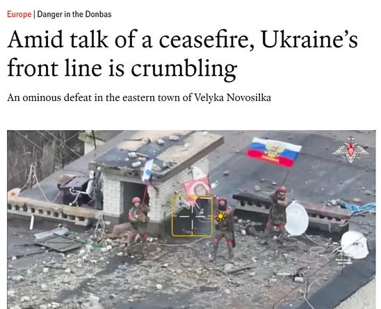 Of course, to think this would cause Putin to capitulate and end the war, even in the worst case scenario, is foolish—that’s simply not going to happen. But that also doesn’t mean there’s no overall dangers for the Russian economy should Ukraine and the West continue scaling up the overwhelming drone saturation capabilities, along with the potential upcoming Trump-led clamp downs on Russian energy. In the meantime, on the actual front lines, things continue going in the predictable direction. Latest from the Economist: Weaving a make-believe tale of ‘uncountable Russian losses’ driving Ukraine’s front collapse, the above article does intersperse some grim insights:
