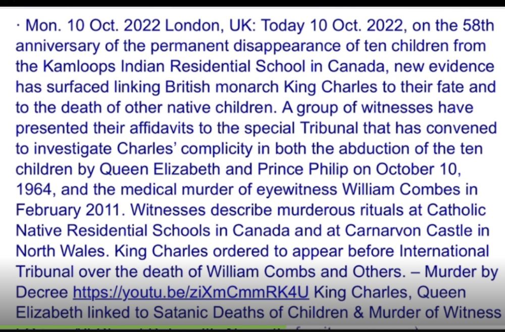 There are plenty of reports of a court case being held in in Belgium in 2014 at the ICCJ and plenty of elites were found guilty, hence the reports of 2019 executions of QEll and Charles. I’ve repeatedly read the queen went on the 5th December that year, different reports always the same date. Obviously a huge amount of secrecy surrounds them, certainly as far as the MSM are concerned, they’ve said nothing. Even just 2 days ago, I was reading an American news report about the above court hearings. Obviously hard facts are proof are difficult to attain, but circumstances and dates are always reported the same, over the last 5 years when I have come across them. I don’t know if anyone is aware of Kamloops from the early 1960’s as one of the more infamous cases involving the royal family and Satanic Ritual Abuse, but it is repeatedly reported on USA news feeds.