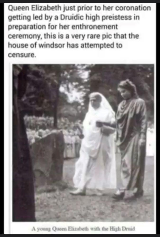 A rare picture apparently of QEll at her druid ceremony