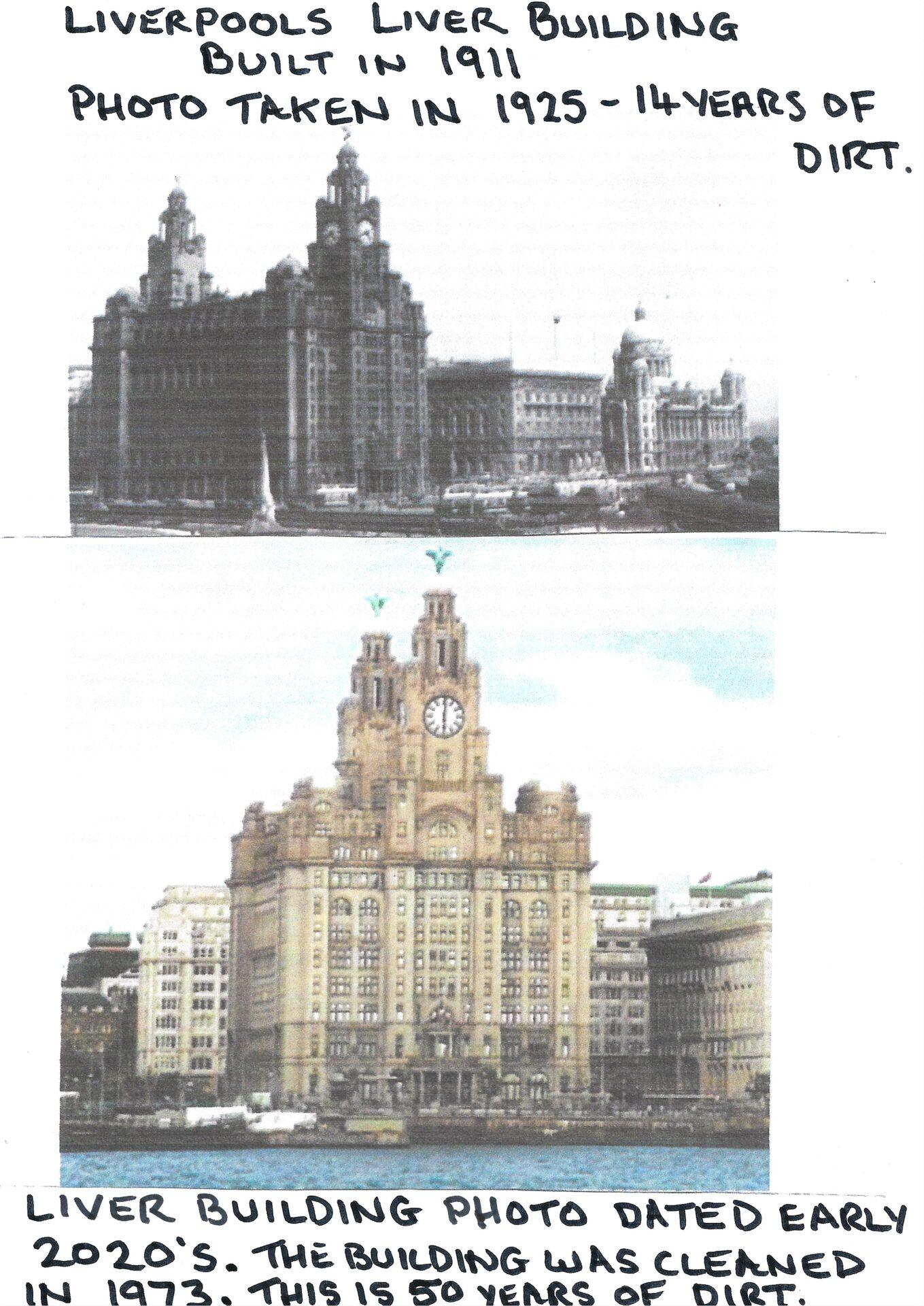 In the lower picture, just to the left and behind the Liver Building you can see a slightly smaller white building which is more like how the new/cleaned up building would have appeared.