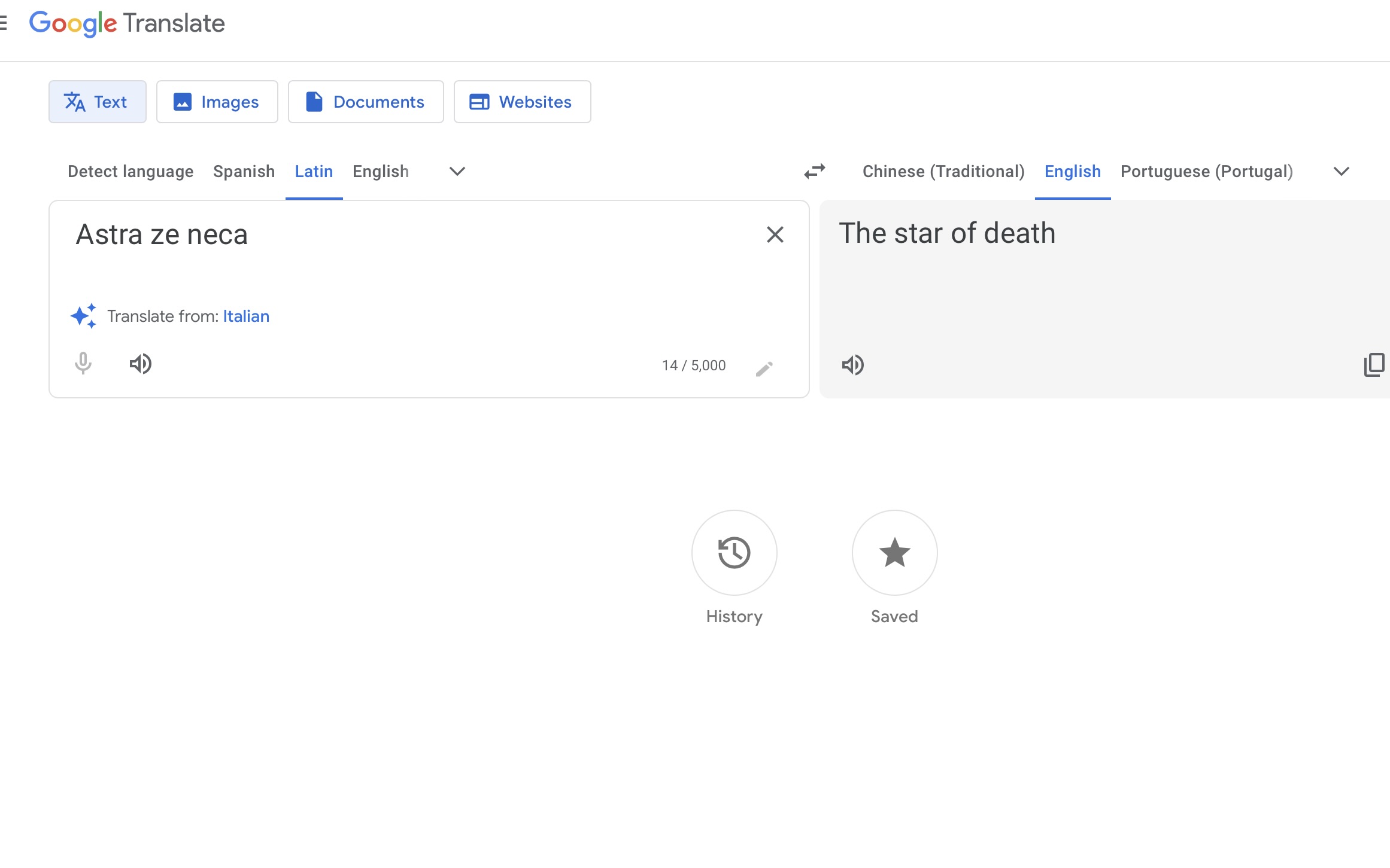While on the subject of the medical industry, I’ve recently come across this and it actually does work on google translate, I’m hoping there is someone with knowledge of Latin who could maybe confirm if it is true or not. Astrazeneca when passed through the google translate page, Latin to English, it comes out as ‘A road to death’ when inputted like this; A stra ze neca’ Can anyone verify this please, I did ask Marianna but she refused to verify it for me.