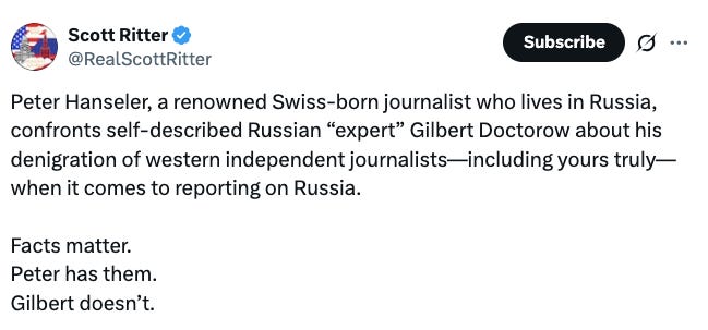 So, Doctorow may pretend that he has the knowledge, but he doesn’t and he certainly doesn’t have it, let alone has understanding, when it comes to military-political proceedings in Moscow. For that, one must have a grasp of warfare fundamentals and Russia’s strategic culture, which he does not have. And Peter Hanseler makes an astute observation, when speaking about such people as Scott Ritter and Larry Johnson: