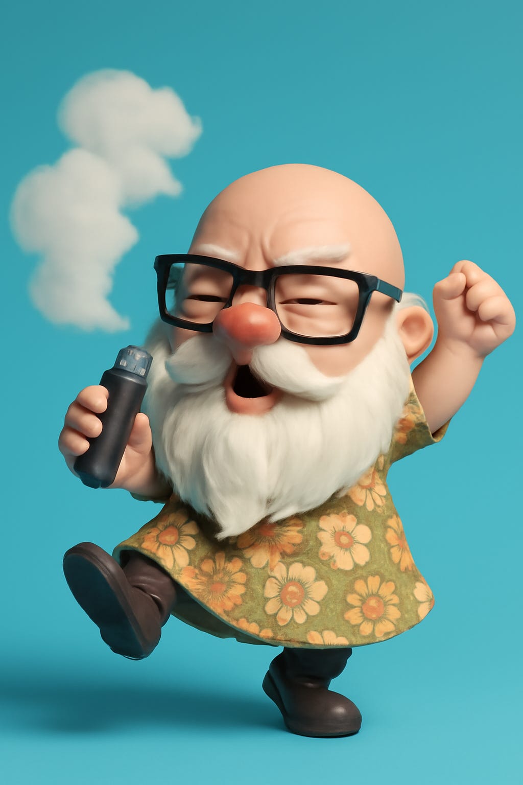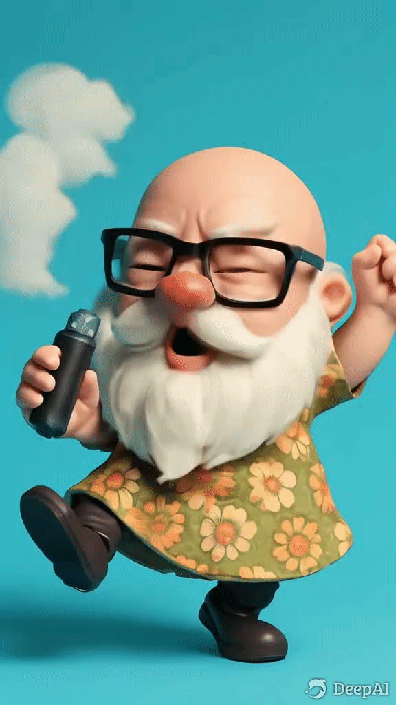ABOVE IMAGE= Manic Goblin, Clown Gnome:- Iaini Davisis. Born from a uncomfortable collision of a BULLFROG FISH & YETI MAGGOT…. In this image he has just sat upon his spare vape after taking a bath. Here we see him use agitated dancing as a means to expel the device (that has been accidently turned on, & is heating up at great speed), hopefully this will go some way to rectify his rapidly, rupturing rectum ?