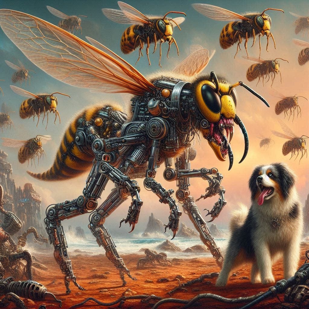 Here is a previously unused image from my artworks, showing what sort of creature genetically manipulated wasp maggots turn into…