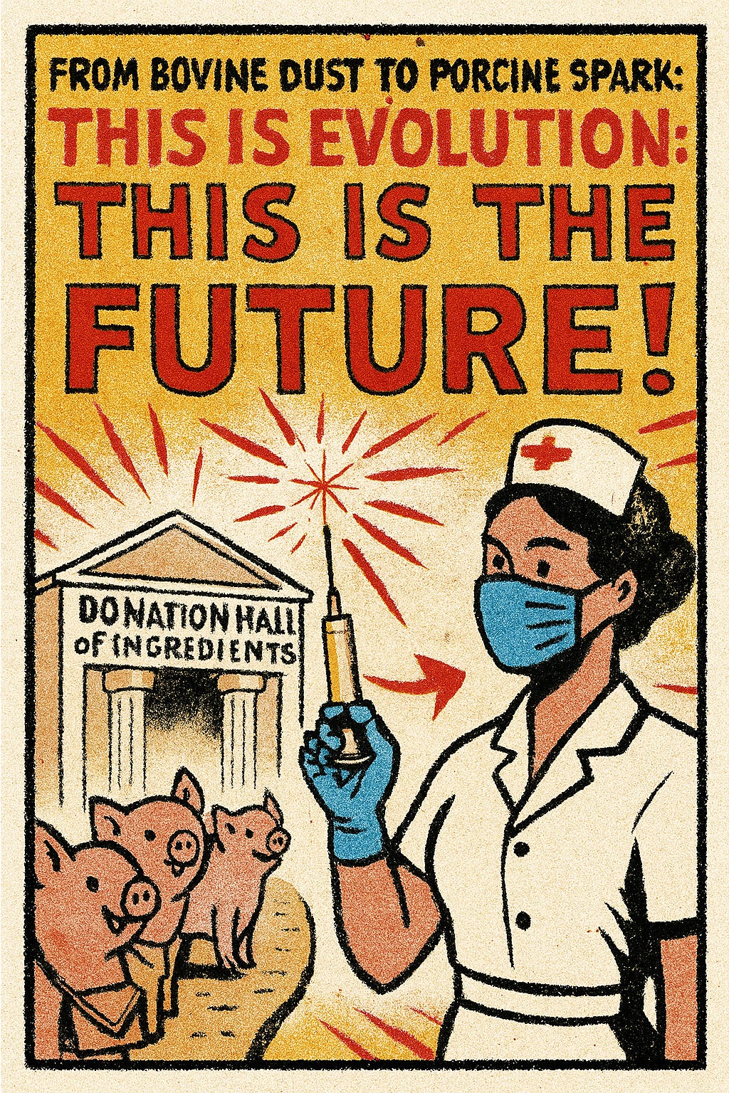 But let us forget these distraction goons, & constructed events they feed off. They are devised to be primarily more tedious argument catalysis & Time Vampire tacticuians. Let us consider what will be marketed very soon upon the much down beaten public- A WHOLE VARIETY OF ANIMAL DERIVED SUBSTANCES. If they can extract particulates & then masticate them into new combinations of upset, they will!