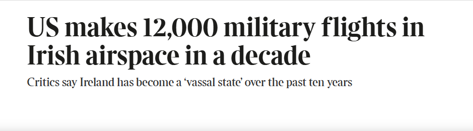 In another N17 Supermac’s plaza exclusive, The Sunday Times ran a rather odd front-pager today. The headline informs the great and the good that over 12,000 US military flights have flown through Irish airspace over the last ten years. Interesting timing, I’d say. I will hazard a wild guess and opine that these flights are increasing not decreasing over the last couple of years and are likely to accelerate even further in the years ahead. The article doesn’t offer comment as to how many of those flights might have extended tails of white smoke trailing across Irish skies but sure that is work for another day, and another newspaper probably.