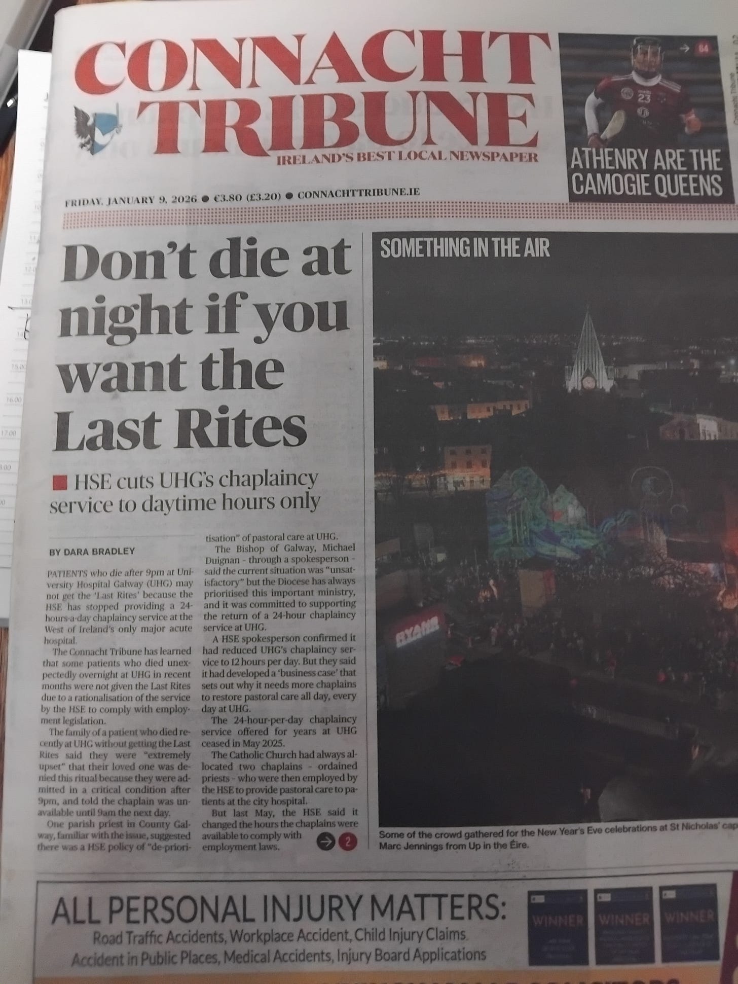 “ Patients who die after 9pm at University Hospital Galway (UHG) may not get the Last Rites because the HSE has stopped providing a 24-hours a day chaplaincy service at the West of Ireland’s only major acute hospital “