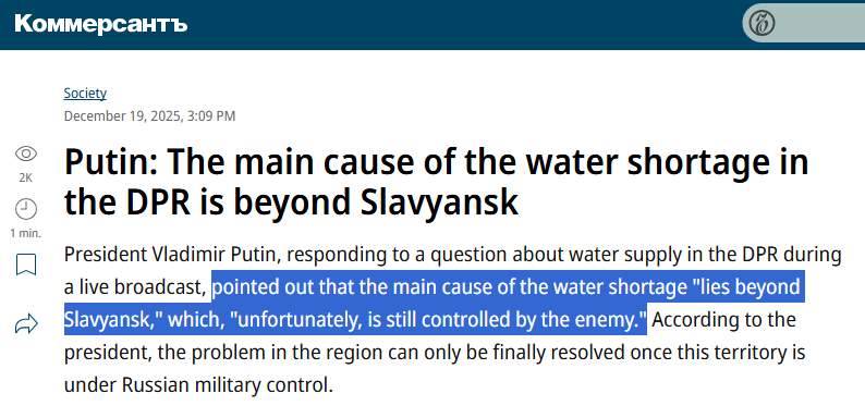 As for the security of the people of Donbass—allegedly the whole purpose of the SMO—well, they’ll just have to be patient. True, it’s hard to be patient when you have no water, but they’ll manage.