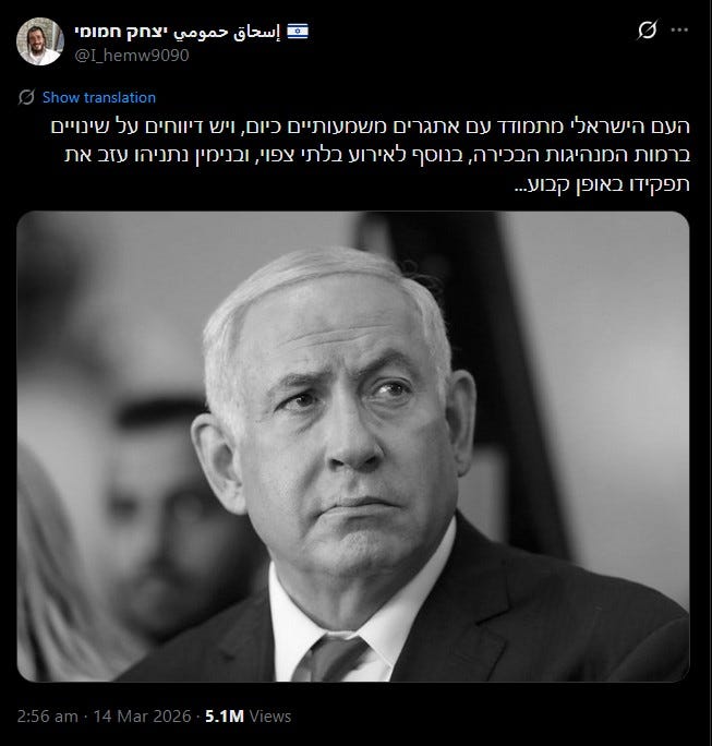 Hezbollah’s response: rockets every thirty to sixty minutes. Not to destroy. To attrit. Keep the sirens running. Keep the Iron Sieve burning interceptors it cannot replace. The strategy is exhaustion and it’s working.