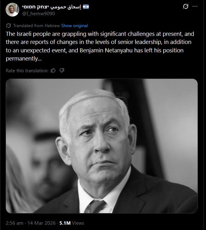 A Hebrew-language post with over 5 million views stated Friday that he “has left his position permanently”. His son Yair, who posts obsessively – 113,000 tweets, something every single day – has been silent for five days.