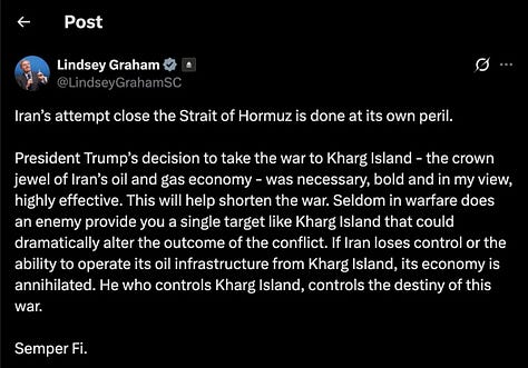 The US bombed Kharg Island on Friday night. B-2 stealth bombers. Via Trump on Truth Social: “One of the most powerful bombing raids in Middle East history”. CENTCOM claimed 90 military targets destroyed while “preserving the oil infrastructure”.