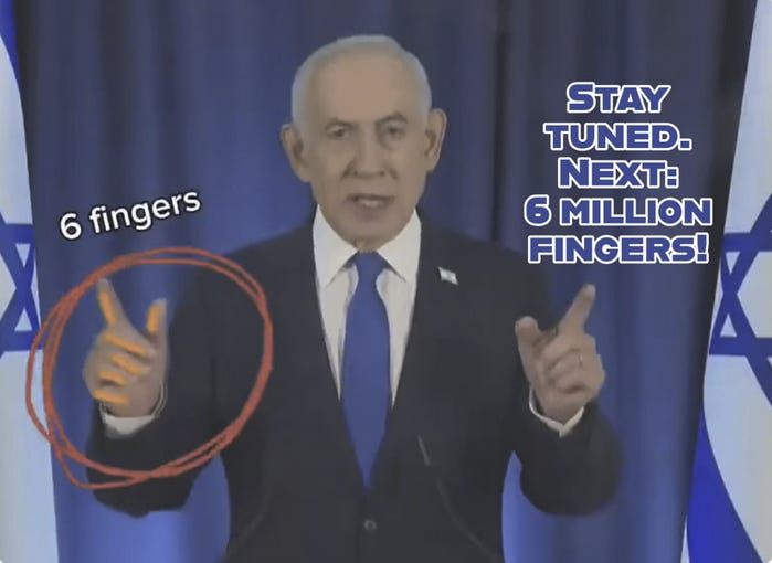 An AI-generated video surfaced from official channels showing Netanyahu with six fingers on his right hand.