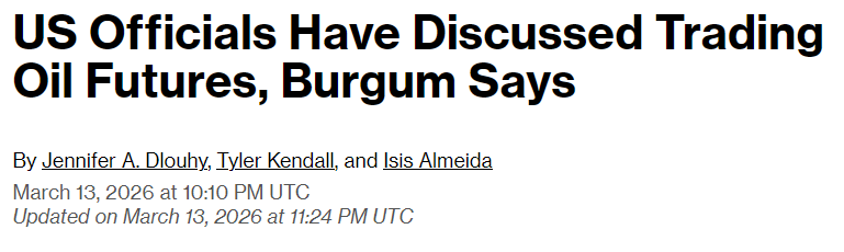 Doug Burgum confirmed the administration is “discussing” entering the oil futures market directly. The CME’s CEO already called that a “biblical disaster”. With Paula White in attendance, maybe biblical is the business plan.