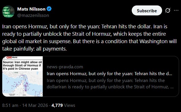 Iran is considering to offer safe passage through Hormuz for tankers paying in Chinese currency. Chinese-flagged vessels have been transiting freely since day one – the yuan condition formalises what was already happening and extends it to everyone willing to pay in the right currency.