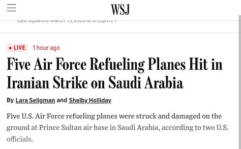 The Wall Street Journal confirmed five KC-135 and KC-46 refuelling tankers struck on the ground at Prince Sultan Air Base. Iranian missile strike. Damaged, not destroyed. No casualties.