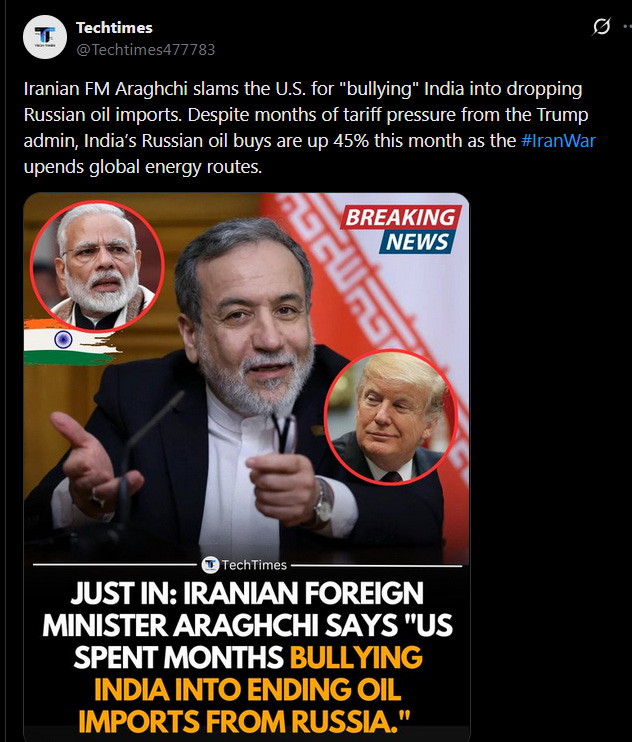 Araghchi’s response was a thing of beauty: “The US spent months bullying India into ending Russian oil imports. After two weeks of war, the White House is now begging the world – including India – to buy Russian crude”.
