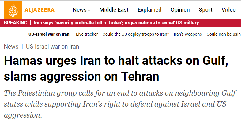 Hamas issued a statement calling on “our brothers in Iran not to target neighbouring countries”. First fracture inside the Axis of Resistance? The organisation Iran armed, funded, and deployed is asking its patron to dial it back. Worth noting: the statement came from Qatar, not Gaza. The Hamas that’s sheltering in Doha has different priorities than the Hamas under rubble.