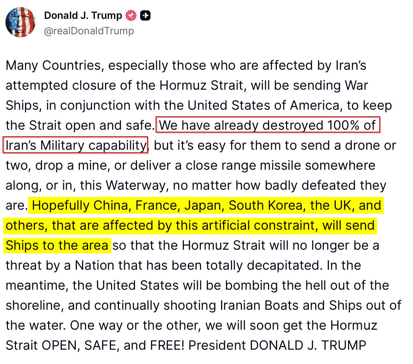 Then this appeared on Truth Social: “Hopefully China, France, Japan, South Korea, the UK, and others, that are affected by this artificial constraint, will send Ships to the area”.
