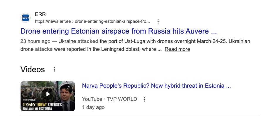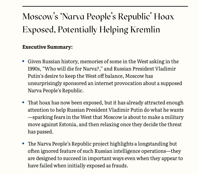 This ties in with another bizarre rumor that is being promoted on Russian State media, through its appointed talking head shills. Namely, that an attack on Narva is being planned — the Kremlin TV and internet channels are talking about liberating and creating a “Narva People’s Republic”, for some reason