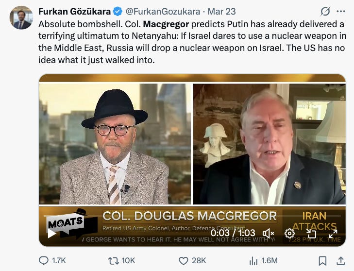 My firm prediction: we will start to hear a lot more about a post-NATO military order from the supposed “Top Patriot” talking heads, who will be all for it (because NATO is morally bad!) and although the details about what will replace it will be deliberately opaque and couched in the moral and aesthetic terms of “Christian Nationalism” … I assure you, that the new world order will have Israel’s needs and security and ambitions right at the center of its mission.