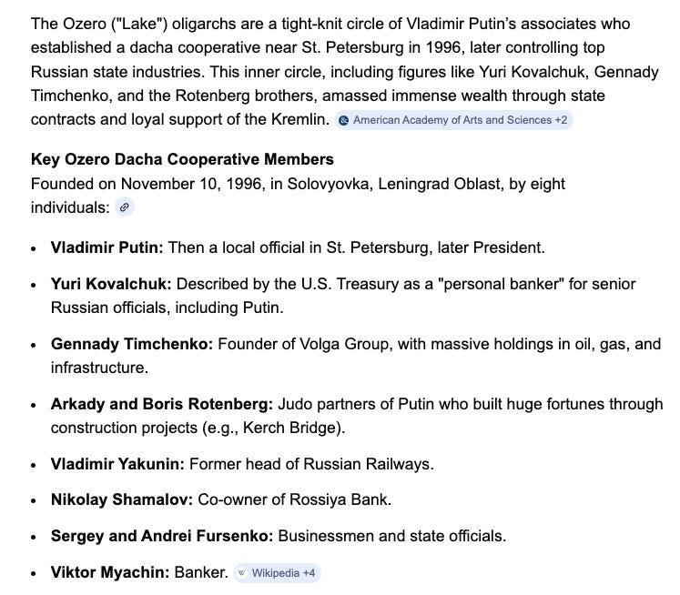 I jumped in here to talk about the Ozero collective. It is a reference to a meeting of oligarchs that took place at a lake (an ozero). In the same way that oligarchs in America met on Jekyll Island to draft out the federal reserve system, so too did some oligarchs in Russia meet on a lake to draft out what “Putinism” would look like.